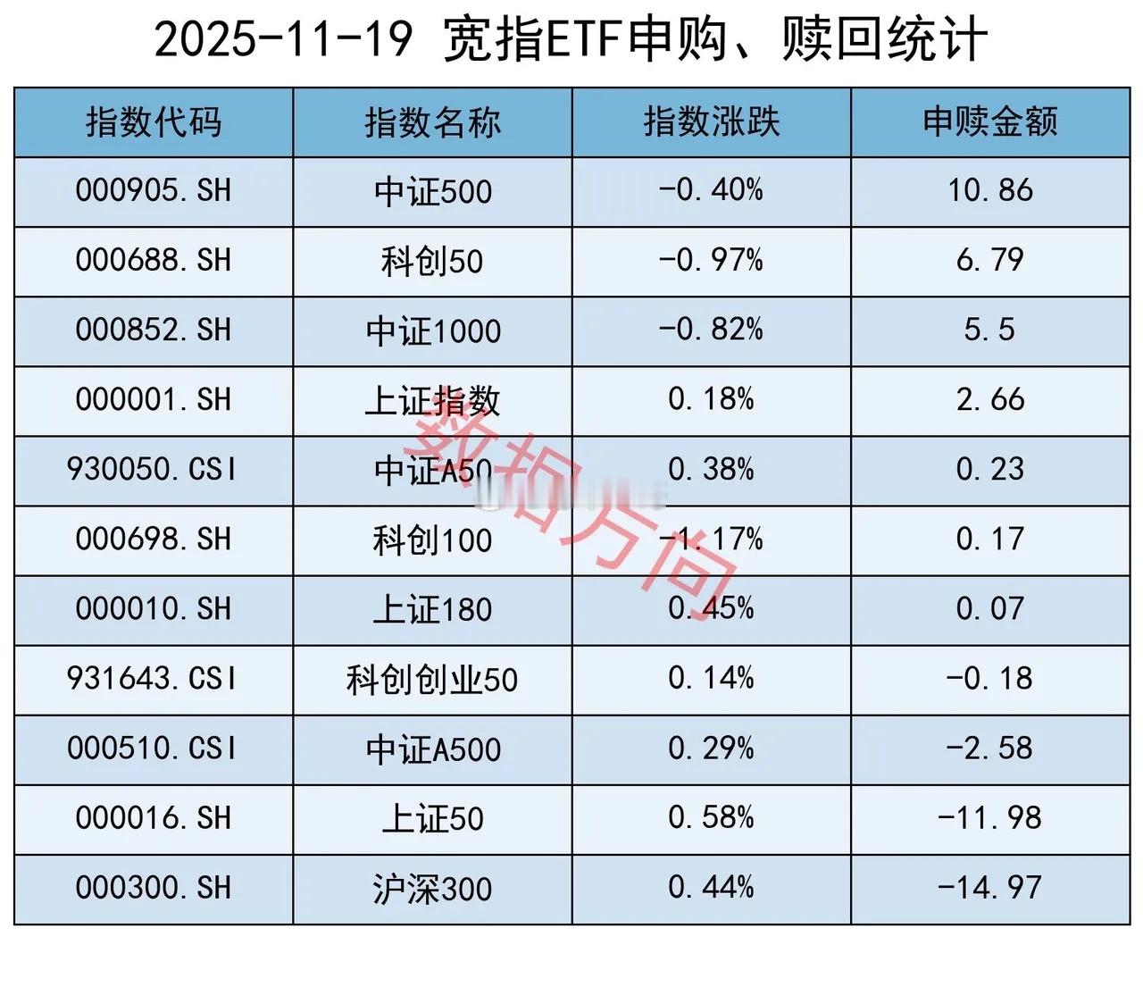 上交所ETF获小幅净申购!11月19日星期三,大盘全天震荡整理,有色金属、油气、水产养殖等涨幅居前。上证指数涨幅0.18%,上交所ETF合计净申购 6.6亿元。宽指中证500指数(10.86亿),净申购超过10亿。科创50指数(6.79亿)、中证1000指数(5.5亿),净申购超过5亿。上证指数(2.66亿)、中证A50指数(0.23亿)、科创100指数(0.17亿)、上证180指数(0.07亿),分别获得小幅净申购。沪深300指数(-14.97亿)、上证50指数(-11.98亿),净赎回超过10亿。中证A500指数(-2.58亿)、科创创业50指数(-0.18亿),分别被小幅净赎回。行业和主题 机器人指数(4.4亿),获最多净申购。科创芯片指数(3.89亿)、半导体指数(2.85亿),一起进入申购榜。科创AI指数(1.78亿)、通信设备指数(1.66亿),一起进入申购榜;5G通信指数(-1.26亿),进入赎回榜。中证军工指数(1.46亿),进入申购榜;中证国防指数(-3.72亿)、军工龙头指数(-1.23亿),进入赎回榜。其他进入申购榜的还有:中证钢铁指数(2.64亿)、恒生科技指数(1.78亿)、CS电池指数(1.2亿)、中证医疗指数(0.99亿)。证券公司指数(-2.97亿)、300非银指数(-0.73亿),一起进入赎回榜。红利低波指数(-2.88亿)、中证银行指数(-2.83亿)、国信价值指数(-0.77亿),一起进入赎回榜。有色金属指数(-1.53亿)、中证煤炭指数(-1.36亿),一起进入赎回榜。