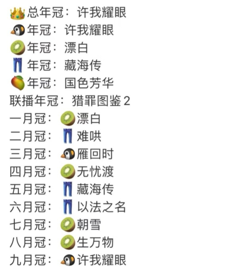 🐧🥝🥭👖四个平台的年冠来了,来看看你追过哪部