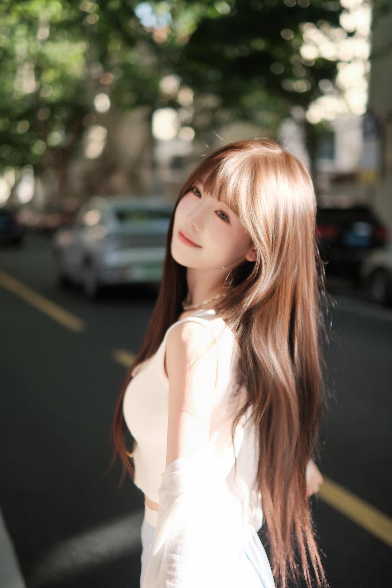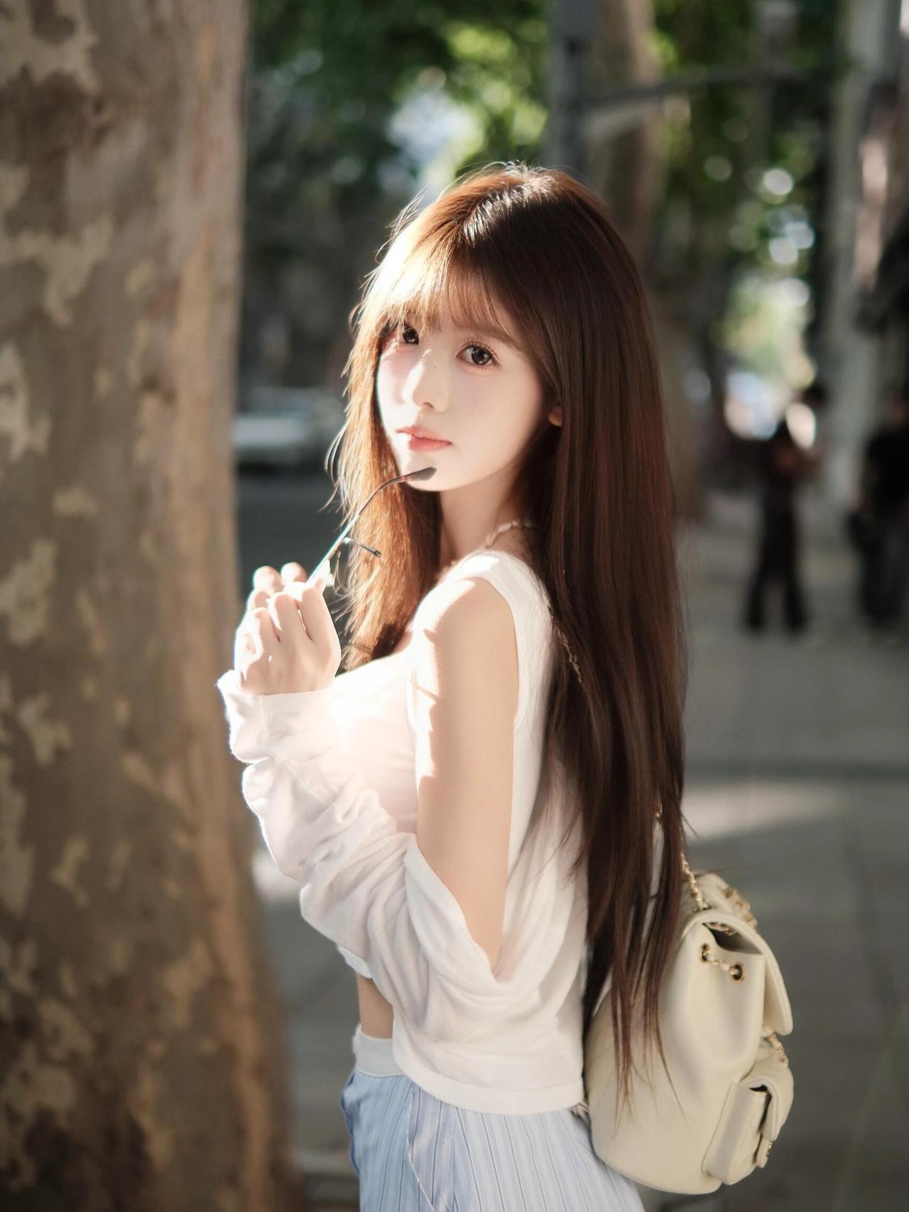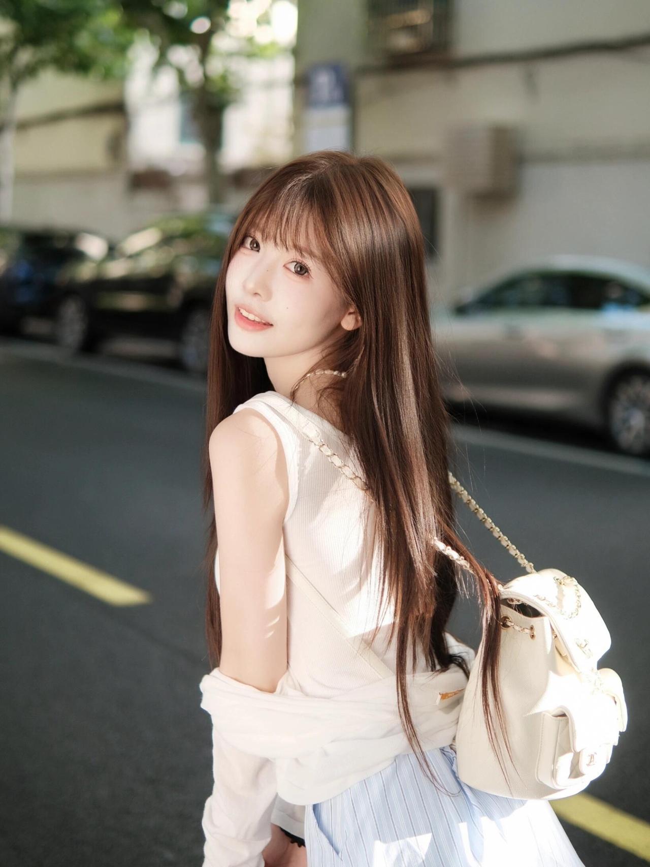 浅色系穿搭裹满温柔,发间的小花是今日份甜妹标识~松弛摆个pose,把日常穿成自己