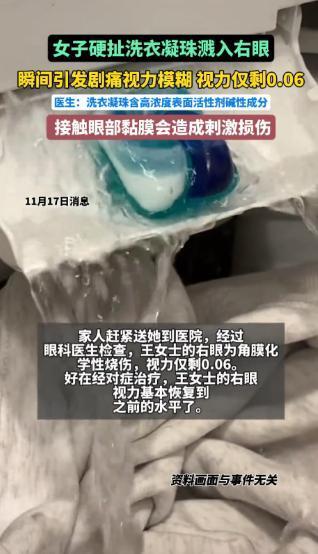 “悲剧还是发生了。”11月报道,浙江杭州,一女子洗衣服时,发现洗衣凝珠黏在了一起,她用力撕扯时,凝珠发生了爆炸,大量洗涤剂溅入眼睛。女子瞬间看不清东西,而且眼睛传来剧烈的疼痛,送往医院检查,发现视力仅剩0.06。网友:还是洗衣粉安全。 洗衣凝珠这东西,说白了就是“高浓缩洗涤剂+水溶性薄膜”的组合,看着方便,实则从生产到使用,每个环节都藏着容易被忽略的隐患。 浙江杭州两位女士的伤眼经历,不过是这些隐患集中爆发的结果。 先说说这珠子本身的“娇气”劲儿。 它能洗得干净衣服,全靠里面高浓度的成分,日化行业专家都说了,这浓度是普通洗衣液的3-5倍,里面的表面活性剂、碱性成分,对眼睛黏膜的刺激和腐蚀性特别强。 更麻烦的是外面那层薄膜,遇水就软、遇热就化,稍微潮一点或者温度高一点,韧性就变差,稍微用力就容易破,这根本不是咱们平时用的洗衣液能比的“娇贵体质”。 可很多人根本没把这当回事,该怎么用还怎么用,完全凭自己的习惯来。 32岁的张女士就是这样,她把凝珠放在潮湿的卫生间里,用完盒子也没密封,凝珠受潮粘成了硬块。 周末洗衣服的时候,她随手就用手去扯那些粘在一起的凝珠,“啪”的一声,薄膜直接破了,高浓度的洗涤剂大半都溅进了她的右眼。 当场她就觉得眼睛像被针扎、被火烫,眼泪止不住地流,眼前一片模糊,连身边的女儿都看不清了。 家人赶紧用清水帮她冲洗,又紧急送医,杭州市第一人民医院检查后说,她是重度眼表化学性烧伤,双眼角膜上皮大面积损伤,右眼视力从1.0一下子降到了0.06,后续还得长期复查,能不能完全恢复都不好说。 另一位杭州的王女士,夏天把凝珠囤在家里,高温把薄膜烘得融化粘连,她也是用力一扯,凝珠爆开,洗涤剂溅进右眼,被浙江大学医学院附属第二医院查出角膜上皮细胞大面积脱落。 其实不止成年人会中招,老人和孩子因为不懂或者不小心,更容易出事。 江苏有位老人,湿着手去拿凝珠,手上的水刚碰到薄膜,薄膜就软了破了,洗涤剂直接把老人的手灼伤,又红又肿疼了好几天。 国内某小区的小孩,见凝珠颜色鲜亮圆滚滚的,以为是玩具,抓着就咬,结果把凝珠咬爆,洗涤剂溅进眼睛引发角膜炎,折腾了好久才好。 国外也有不少这样的事,孩子把凝珠当球捏,捏爆后洗涤剂喷一脸,眼睛又红又肿。 还有老人把凝珠放厨房,孙女误当糖果塞进嘴里,幸好发现得早,没酿成大祸。 这些意外看着是偶然,其实都是产品特性、使用习惯和环境因素凑到了一起。 一方面是珠子本身薄膜脆弱、成分刺激,另一方面是咱们存放随便、使用不当,再加上有些厂家做得也不到位。 低价产品的薄膜韧性更差,包装密封性不行,安全警示印得又小又偏,粘连了该怎么处理、溅到眼睛该怎么办,这些关键信息要么含糊,要么干脆没有。 行业里的标准也有漏洞,对洗涤剂浓度、pH值有要求,可对包装防潮性、薄膜耐用性这些细节,规范得不够细,这就给危险留了口子。 美国和英国的相关部门早就发过警告,说每年都有儿童因为凝珠出事,得加强监管。 网友们也吐槽,说凝珠包装像糖果,容易误导孩子,厂家光想着卖货,没把安全做到位。 其实要避开这些危险,也不用多复杂,关键是把每个细节都做到位。 存放的时候,别图方便放卫生间或阳台,选阴凉、干燥、通风的地方,最好锁在孩子够不到的高处,每次用完一定要把盒子密封好,别让潮气进去。 取凝珠的时候,手必须擦干,绝对不能湿着手碰。 要是不小心把洗涤剂溅进眼睛,第一反应千万别揉,一揉只会让腐蚀更严重,得立刻用大量流动的清水或者生理盐水冲眼睛,至少冲15分钟。 而且冲的时候多转动眼球,确保每个角落都冲到,然后赶紧去医院,记得把产品包装带上,方便医生了解成分。 家里有孩子的,一定要提前跟孩子说清楚,这东西不是糖,不能吃也不能玩,还可以找些安全动画一起看,让孩子记牢。 厂家这边也得用点心,包装做得更密封点,薄膜选韧性好、抗潮性强的,安全警示用大号字体印在显眼的地方,把该提醒的都写清楚,别光想着销量。 社区、学校和媒体也该多做点科普,把这些安全知识讲透,让大家都知道凝珠不是随便用的,得注意这些细节。 那么到最后,你们是怎么看的呢? 如果各位看官老爷们已经选择阅读了此文,麻烦您点一下关注,既方便您进行讨论和分享,又能带来不一样的参与感,感谢各位看官老爷们的支持!