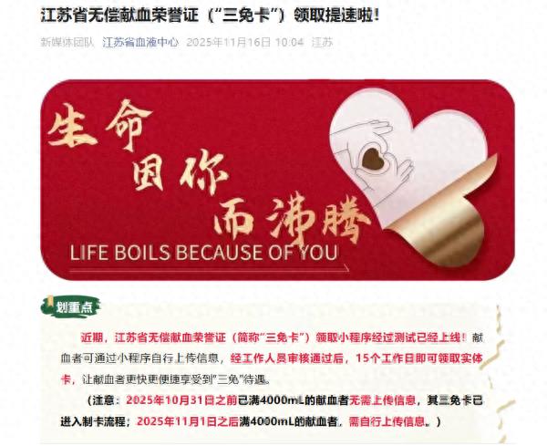 金山网讯记者从镇江市中心血站了解到,近日,江苏省无偿献血荣誉证(简称“三免卡”)领取小程序正式上线运行。符合条件的献血者通过微信搜索“江苏省无偿献血电子证”小程序,即可在线提交个人信息和证件照片,审核通过后,15个工作日内即可领取实体“三免卡”,享受在全省范围内免费游览政府投资主办的公园、旅游风景区等场所,到政府举办的医疗机构就诊免交普通门诊诊察费,免费乘坐城市公共交通工具的“三免”待遇。
