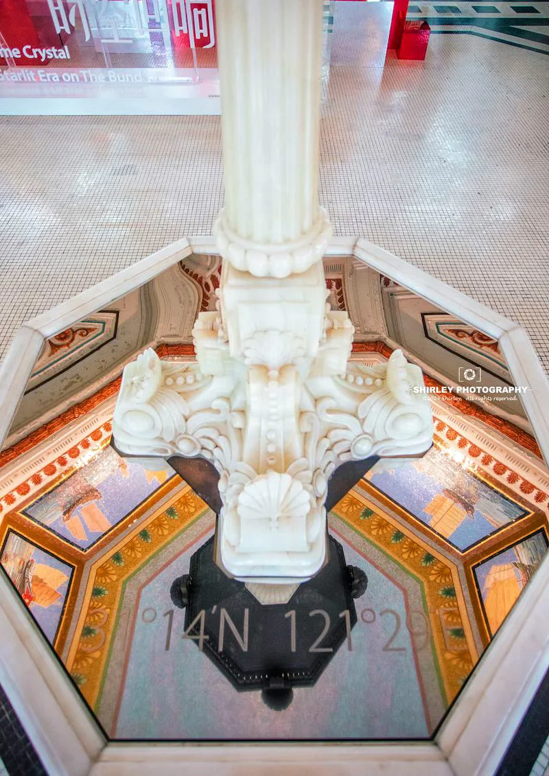 位于藻井下方,底座由汉白玉制成;镜面灯座上刻经纬坐标——北纬31°14’,东经121°29’,这个位置与顶层钟楼的旗杆位置在一条纵轴上,曾经是上海的地理原点。