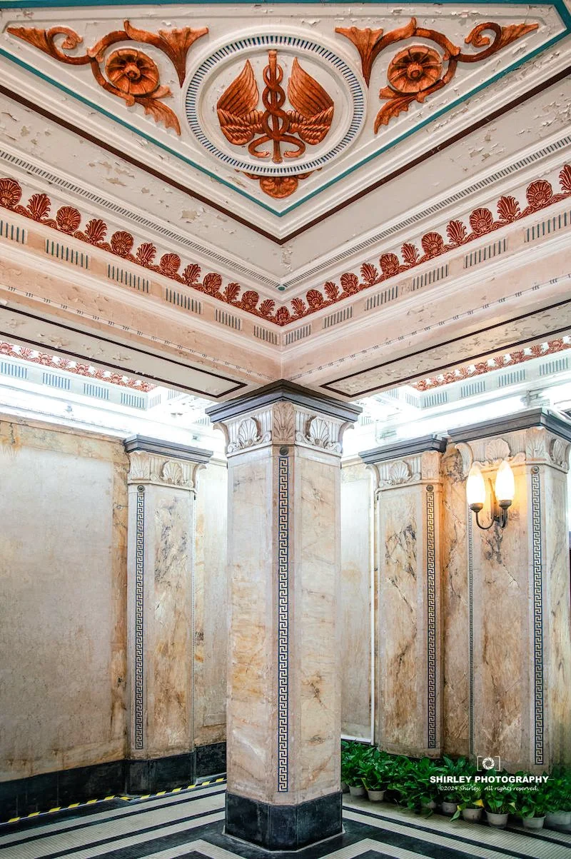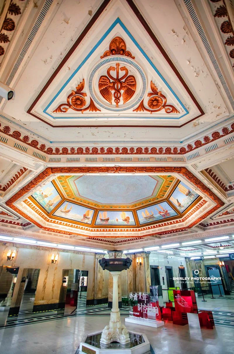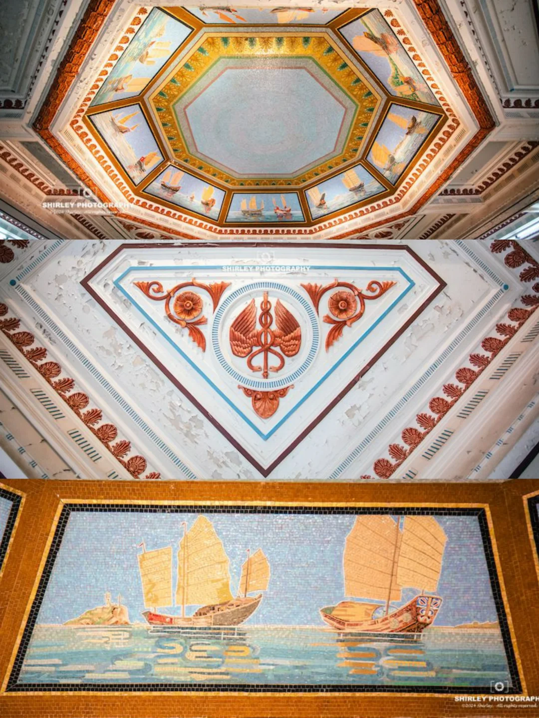 八面各有一幅用一万多颗天然色彩马赛克镶嵌而成的帆影海事壁画,工艺精湛。藻井四角的石膏雕刻图案是国际通行的海关标识——商神杖,后来成为中国海关的标识元素之一。