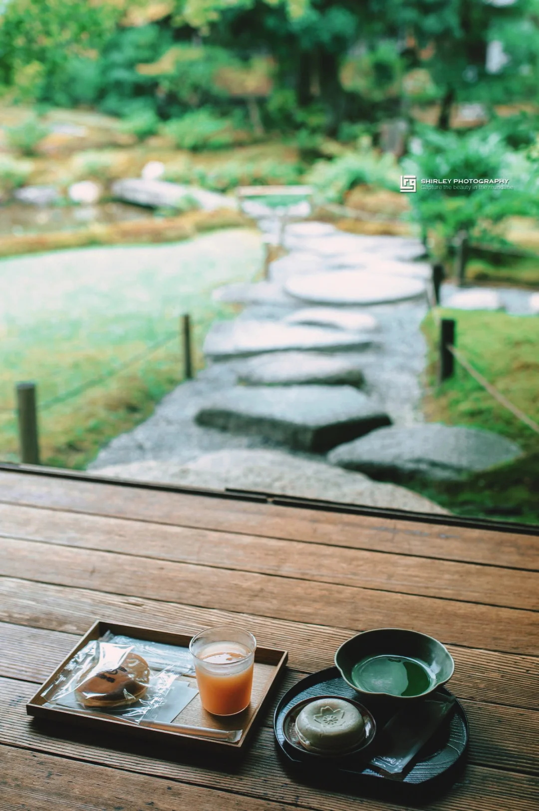 提供茶点的种类不多,坐在檐下一边饮茶一边赏园,再喝一杯冰抹茶暑气全消。终于可以什么都不做,只是静静地坐看天色渐暗、游客散去、然后尽兴而归。