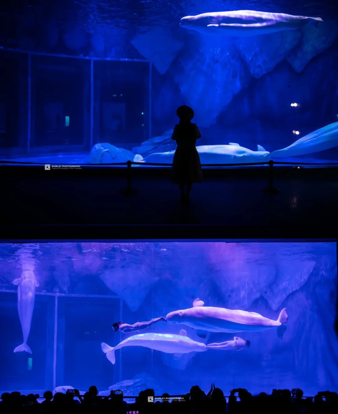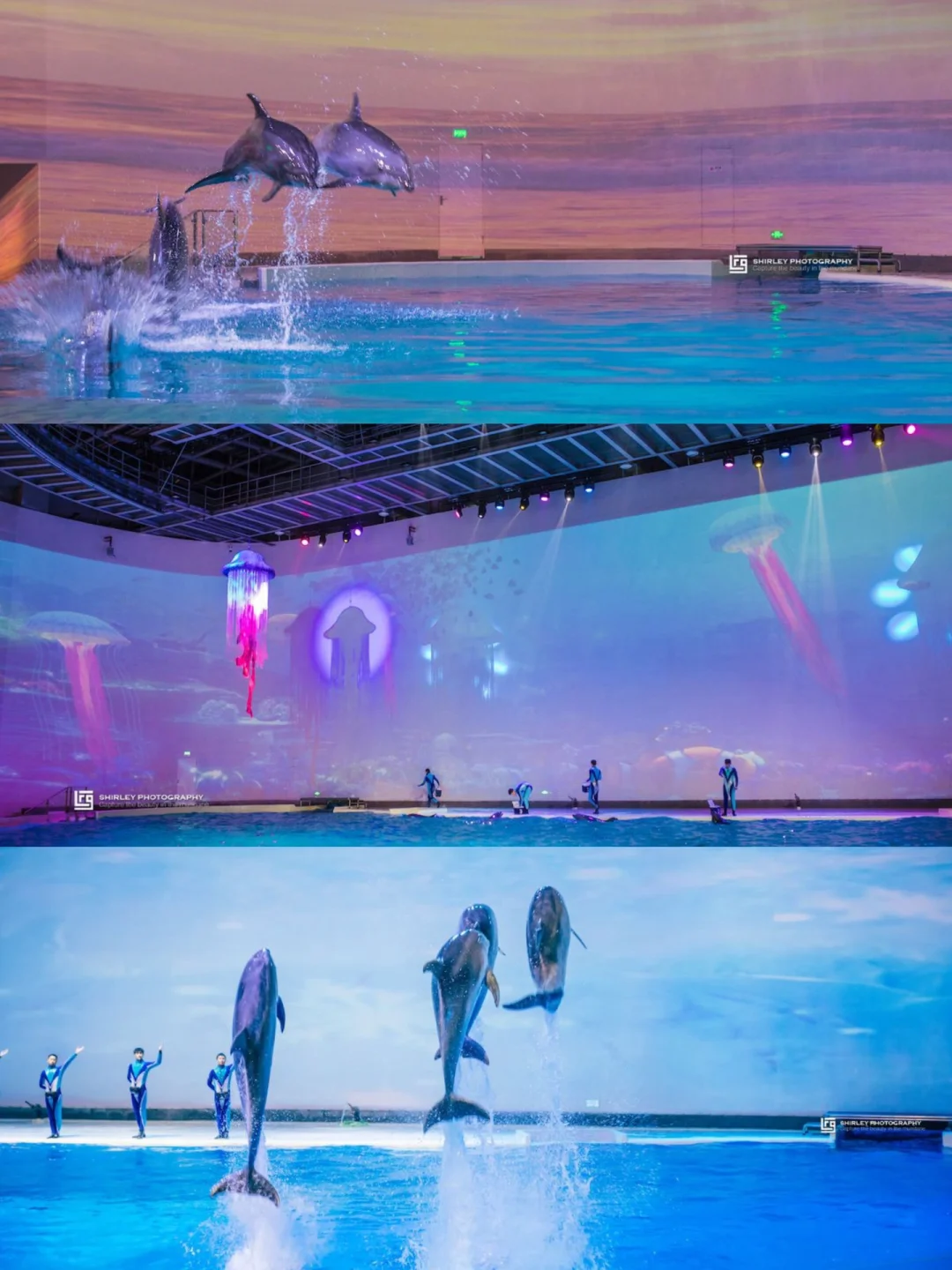 室内剧场,舒适度满分。不是单纯的海豚表演,而是配合声光电水幕秀,艺术效果拉满
