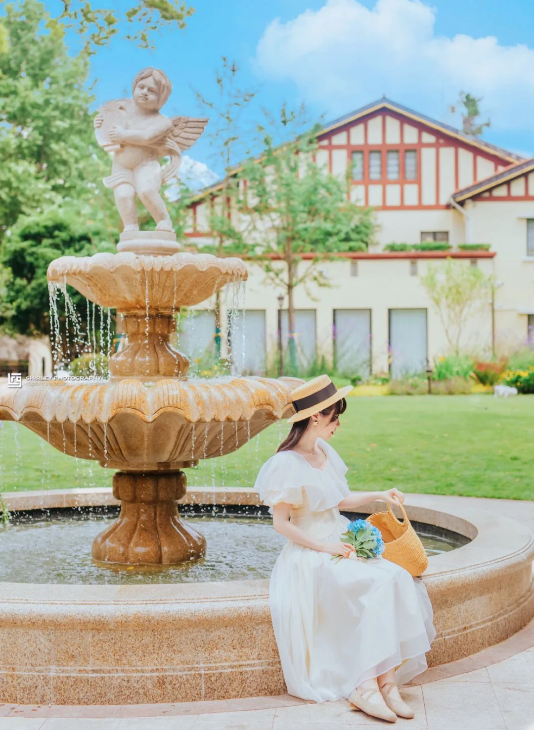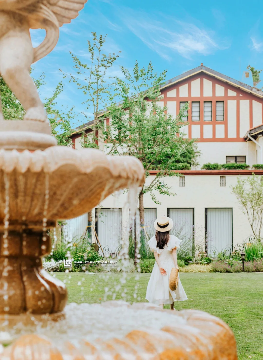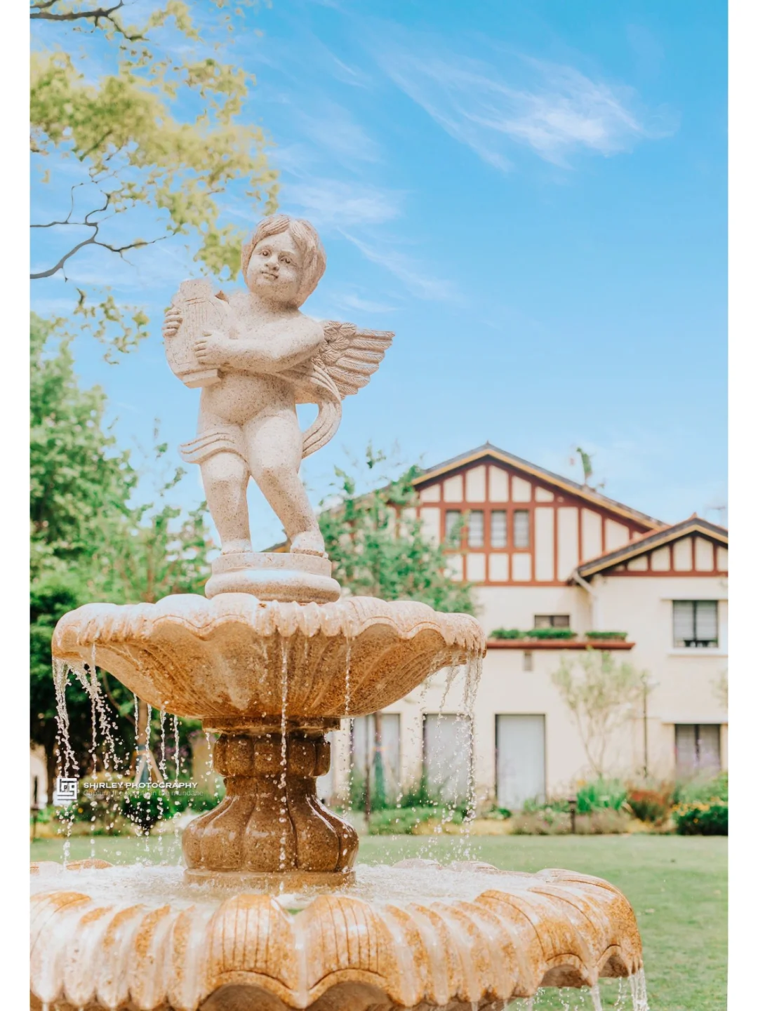 ▫️远处的小楼双坡红瓦屋面,白水泥拉毛墙面,透露着浓浓的法式风情。近处则是复古的欧式喷泉、精致的绿色草坪、曲折蜿蜒的小径,随手一拍就有油画即视感。和有着“东方的香榭丽舍大街”之称的衡山路,调性很搭。