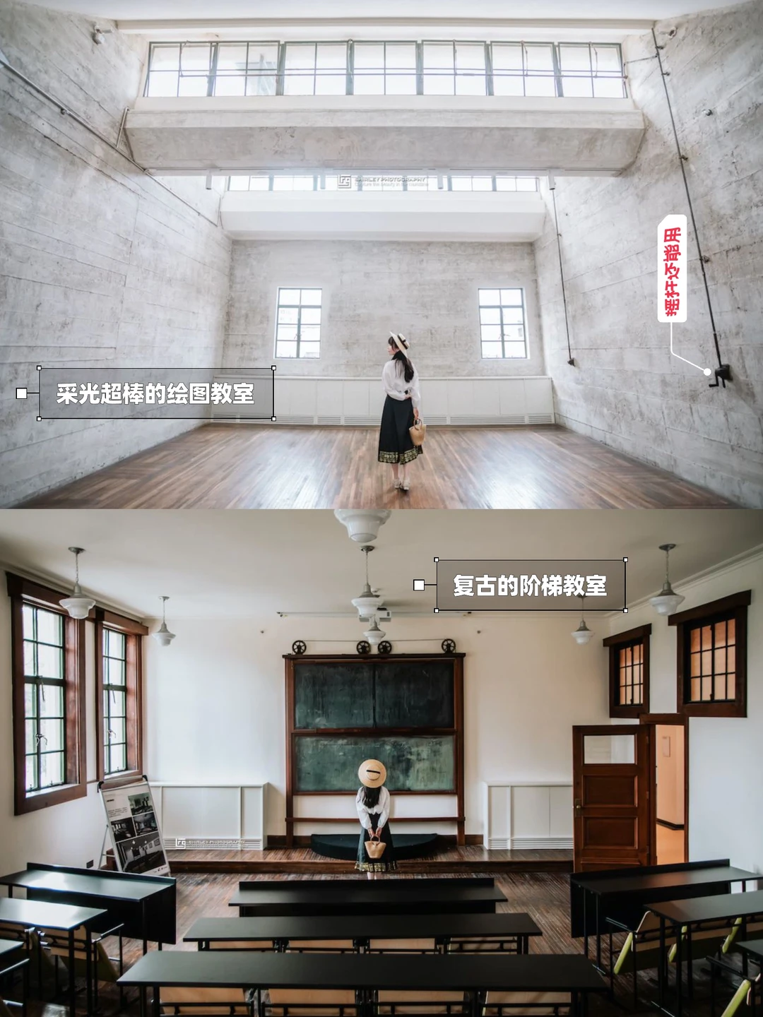 3️⃣层:绘图教室,顶部的锯齿天窗引入自然光线,有利于学生绘图。过去的摇杆依旧可以打开窗户。
