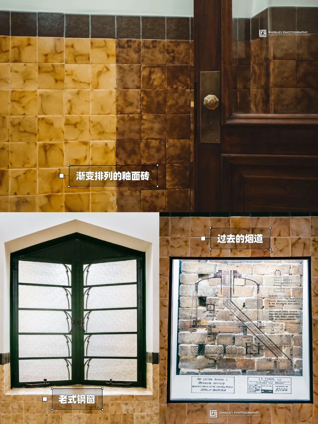 🔸建筑内部有上千块棕色釉面砖,大部分是原物,为1934年从英国进口。部分墙体的釉面砖呈现渐变色的效果,也是根据过去复原的。
