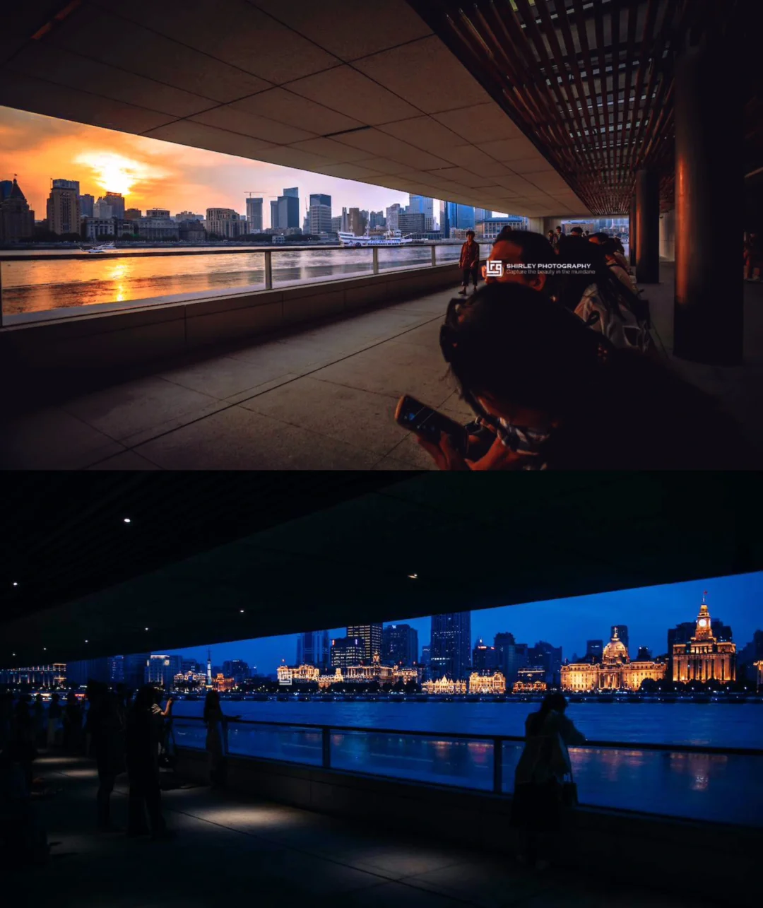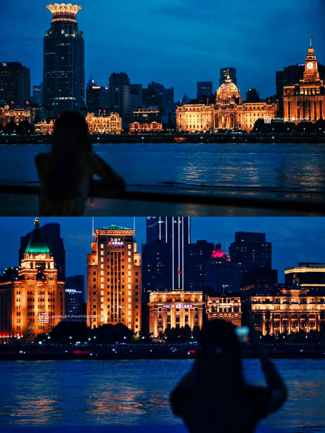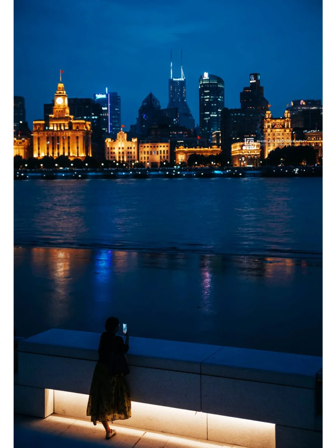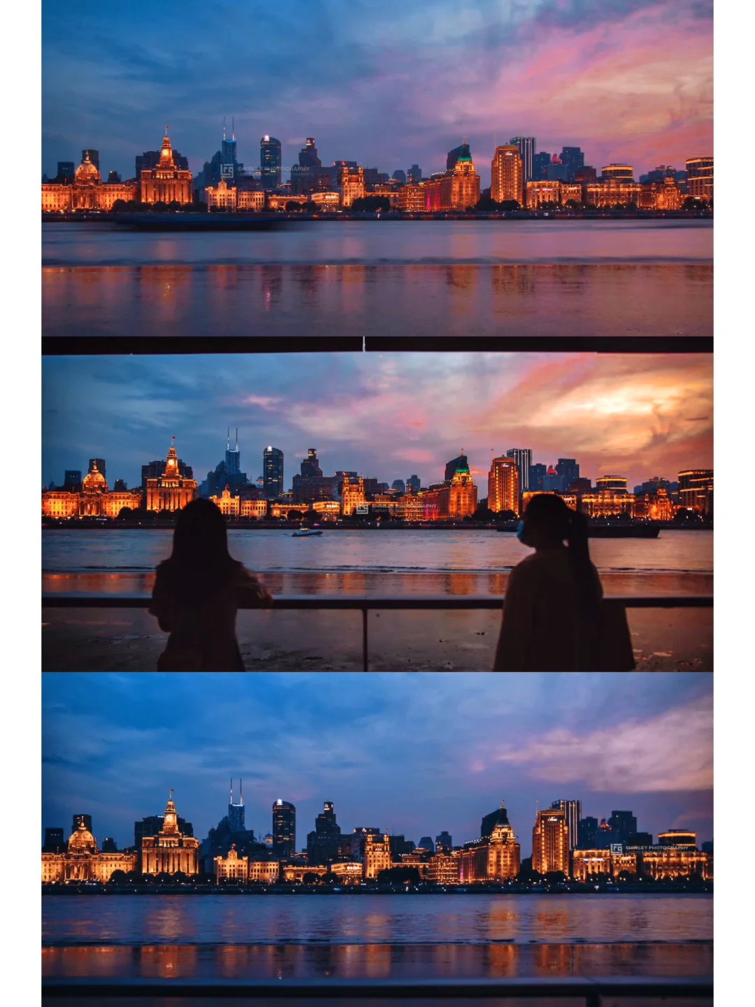 🔺以拍摄这组照片的6月为例,18:30之前到达,可拍摄落日晚霞;19:00外滩开灯,可拍摄bluetime时的亮灯建筑群。