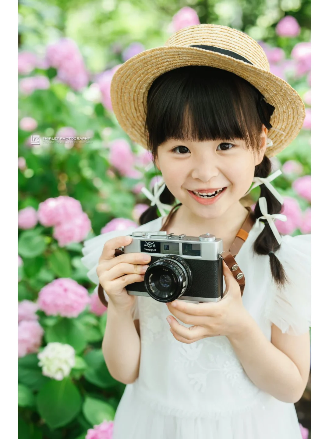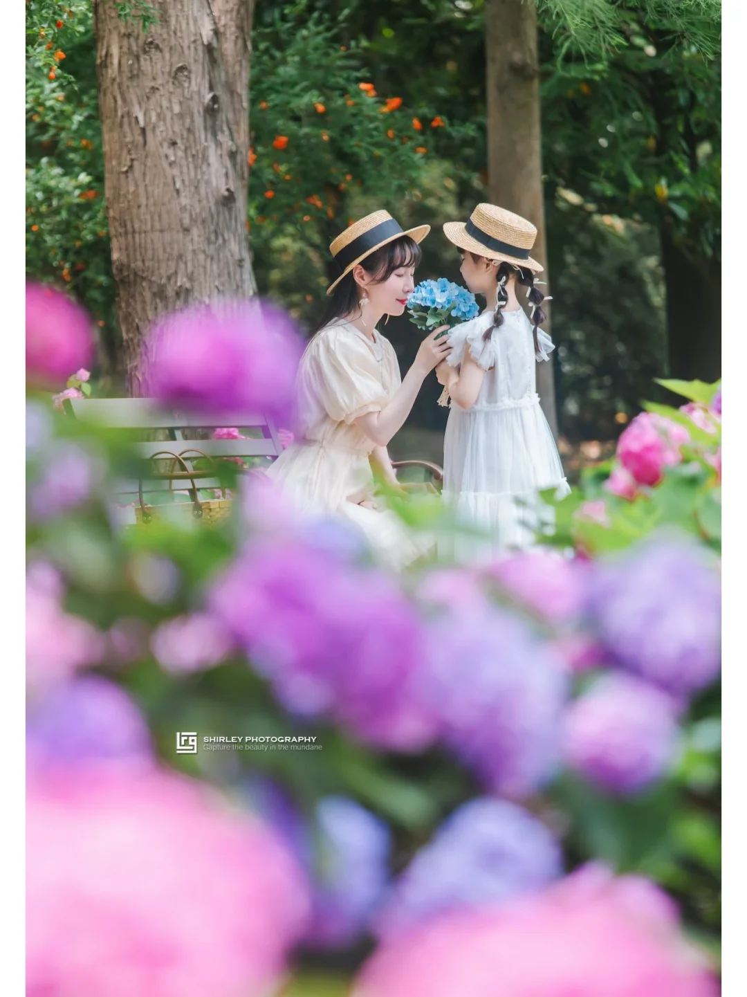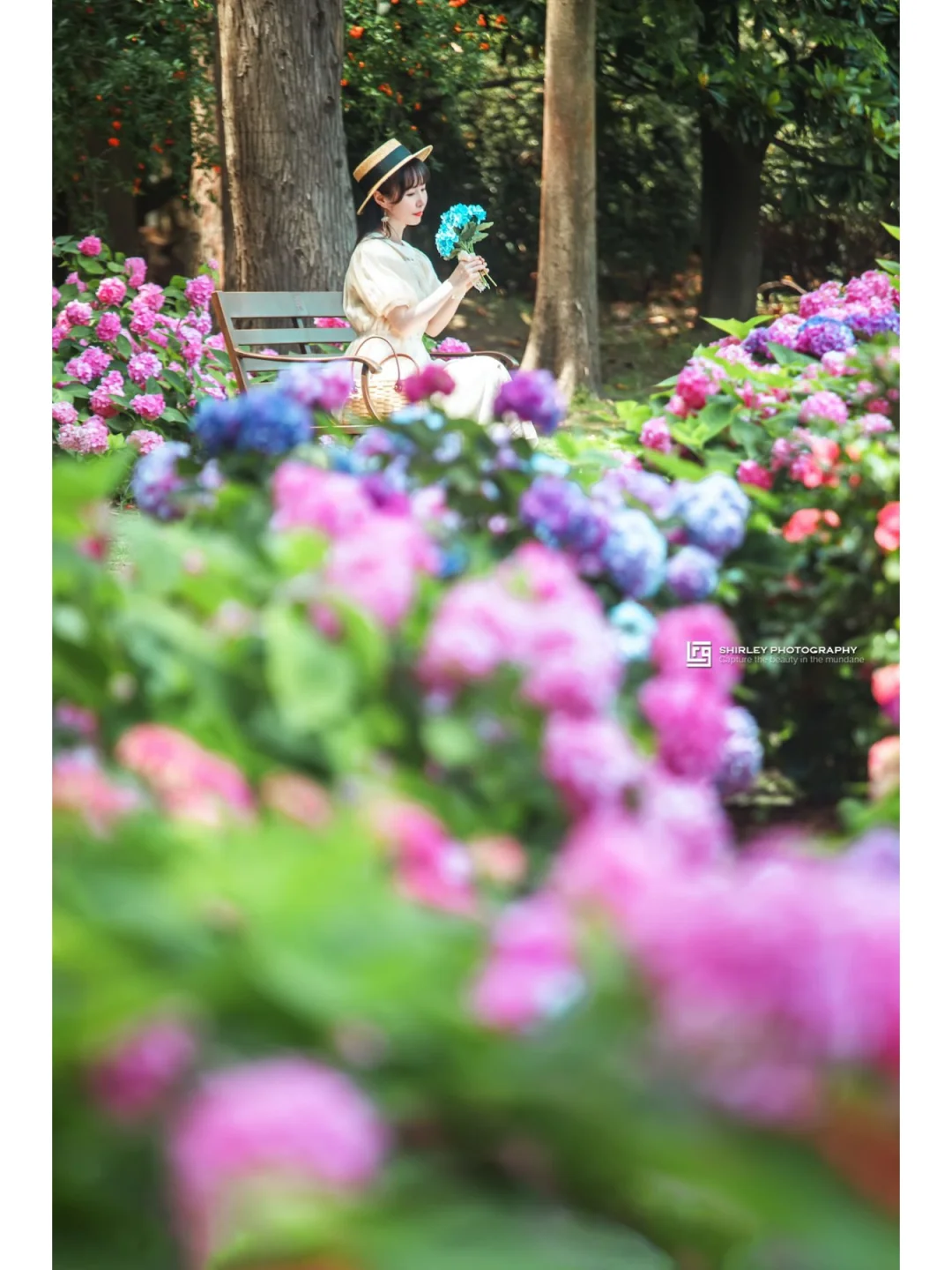 在这个路口往北走一点,就能拍到一条两边都是绣球花丛的小路,路的镜头是一张很有电影感的长椅