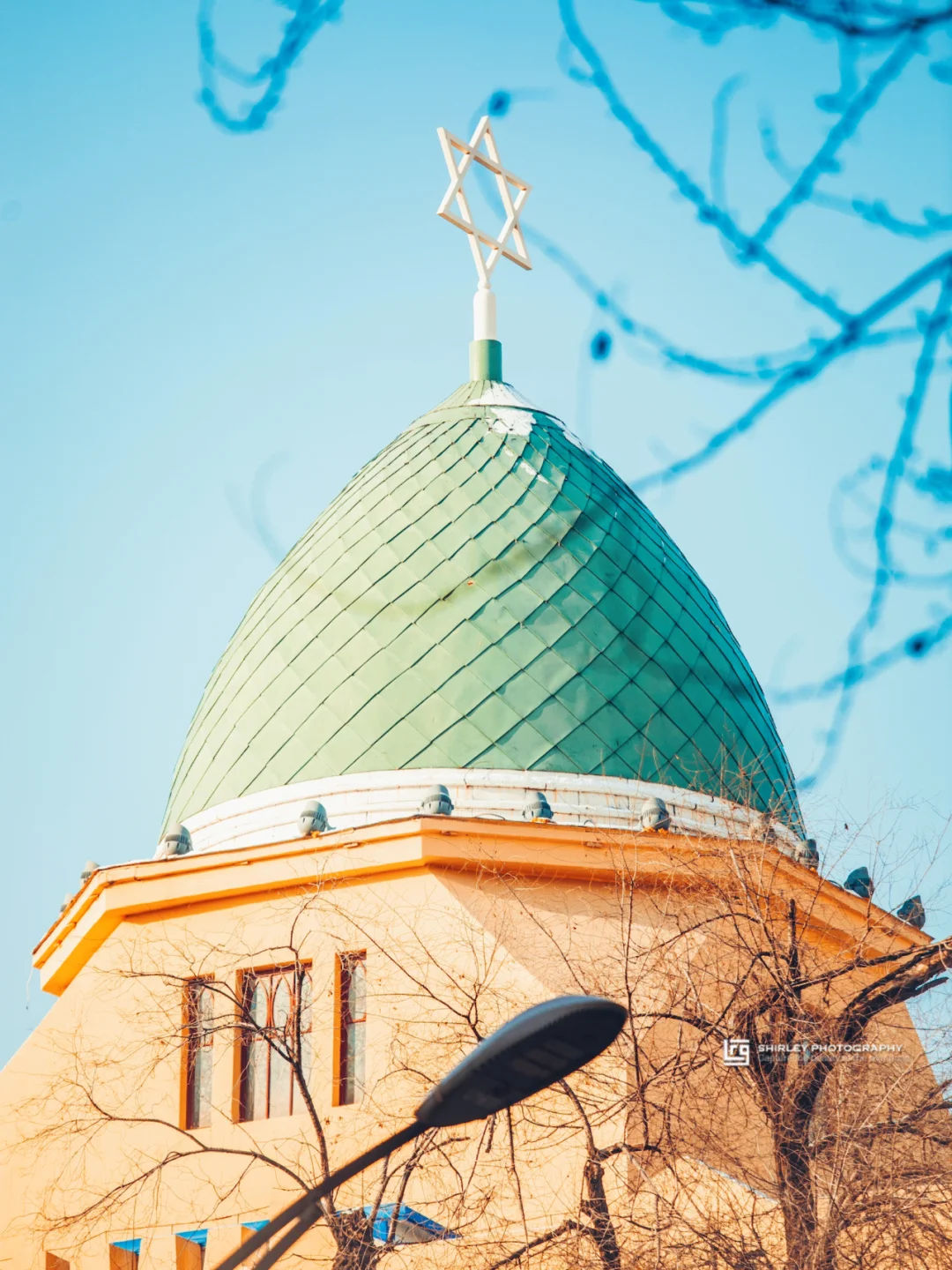 💠整体为二层砖石结构建筑,马蹄形窗、镌刻在门柱上的希伯来文、巨大的绿色穹顶、顶部大卫之盾六角圣星仍在演绎着犹太“神韵”。建筑的黄绿配色在阳光下相当明艳轻快,分外动人。