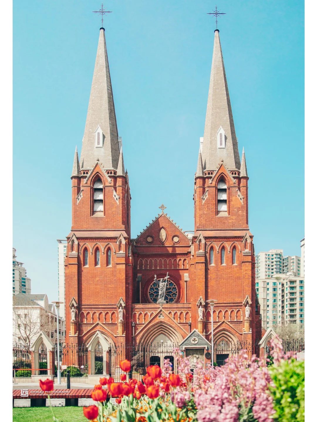 清水红砖的外墙、青灰色的石板瓦顶在阳光下熠熠生辉,两个哥特式钟塔南北对峙,直插云霄。