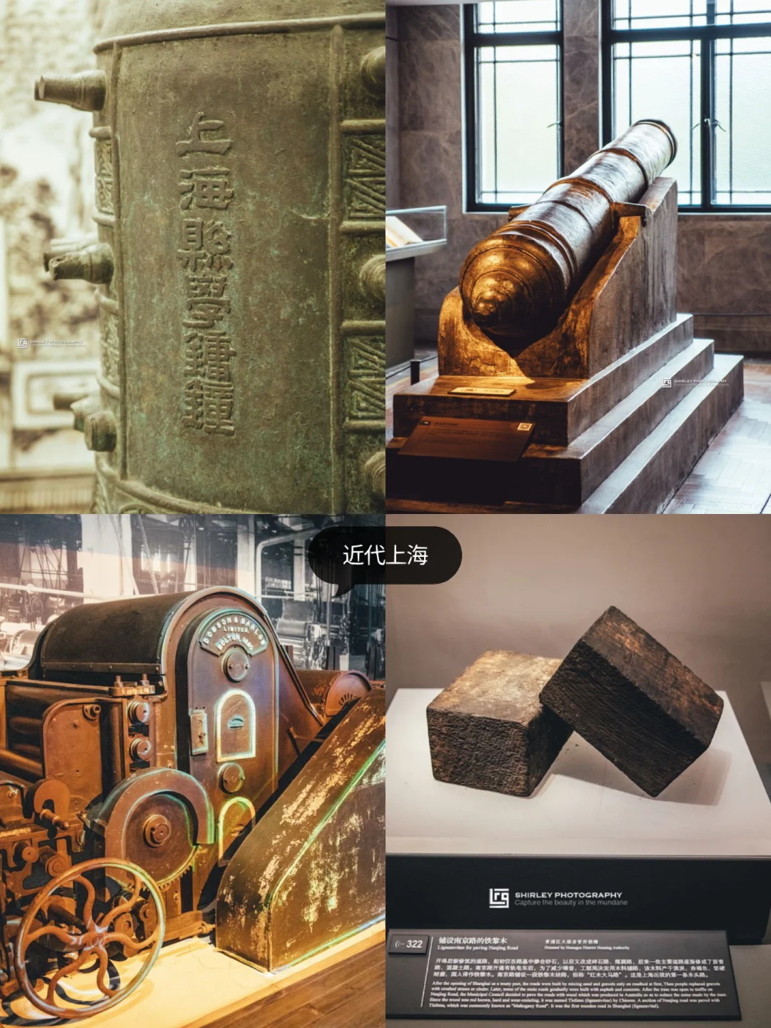 🎈三、四楼为近代上海展厅,聚焦开埠以后。其中,1841年江南提督陈化成督造的振远将军铜炮、1895年英商道白生公司制清花机、清同治八年的上海县学镛钟、用来铺设南京路的铁黎木等都是值得一看的展品。