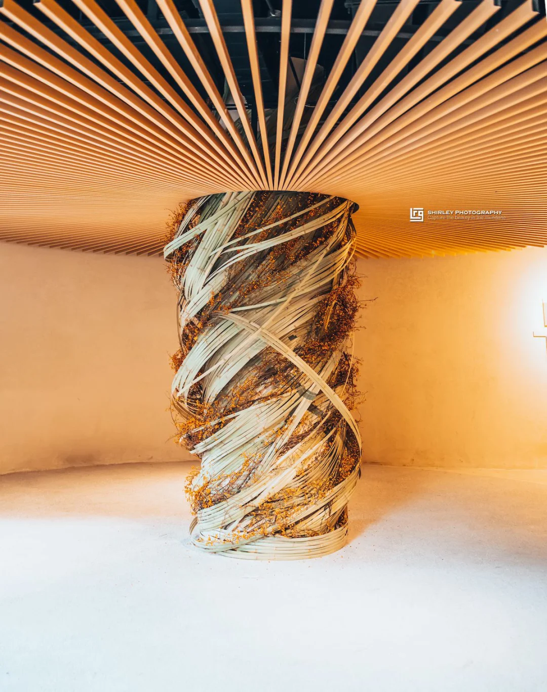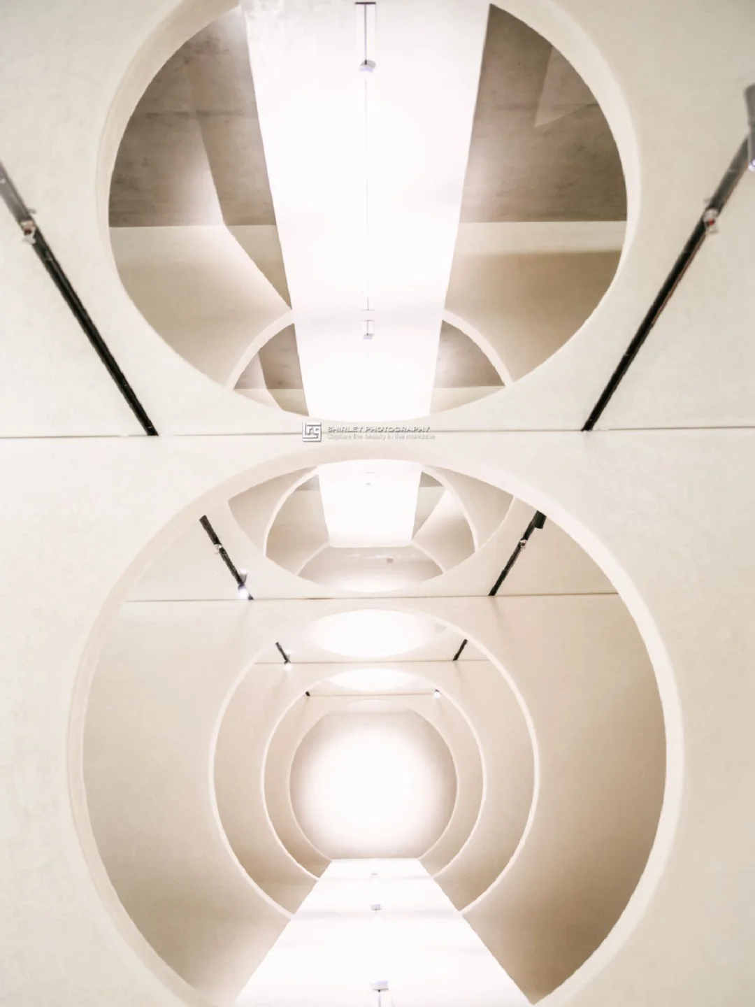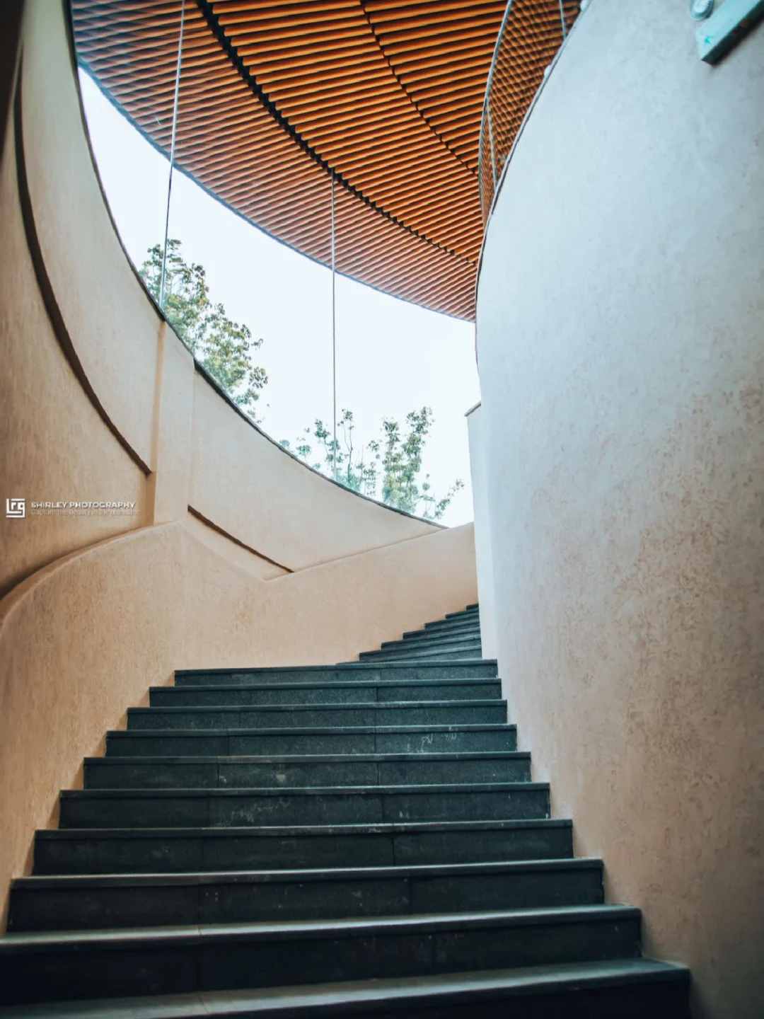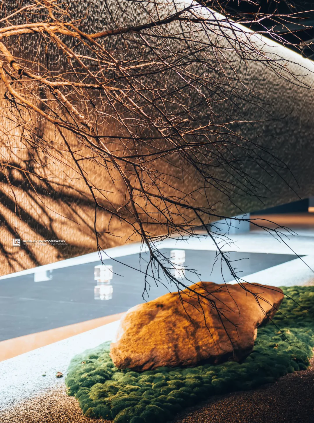 🌲除此之外,其他地方的设计也颇具艺术感。墙上横乱的树枝,地上青苔与石块看似随意,却又自成景观。连续的圆窗延伸了视觉焦点,让人想起了北京的红砖美术馆。