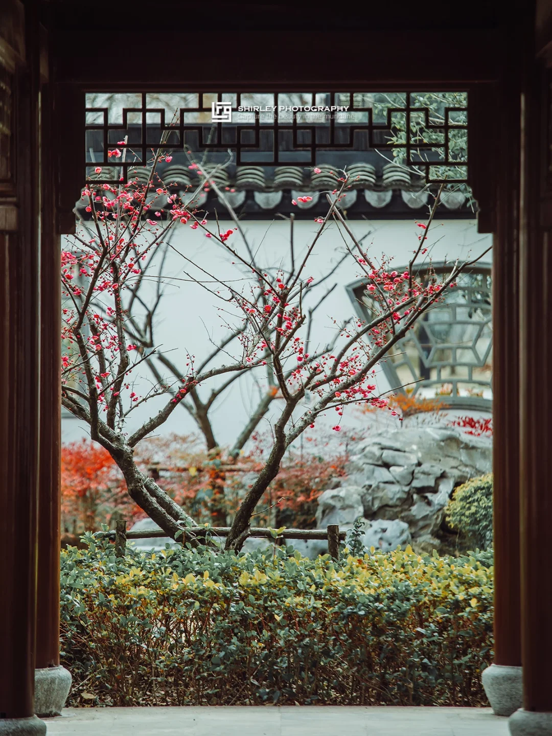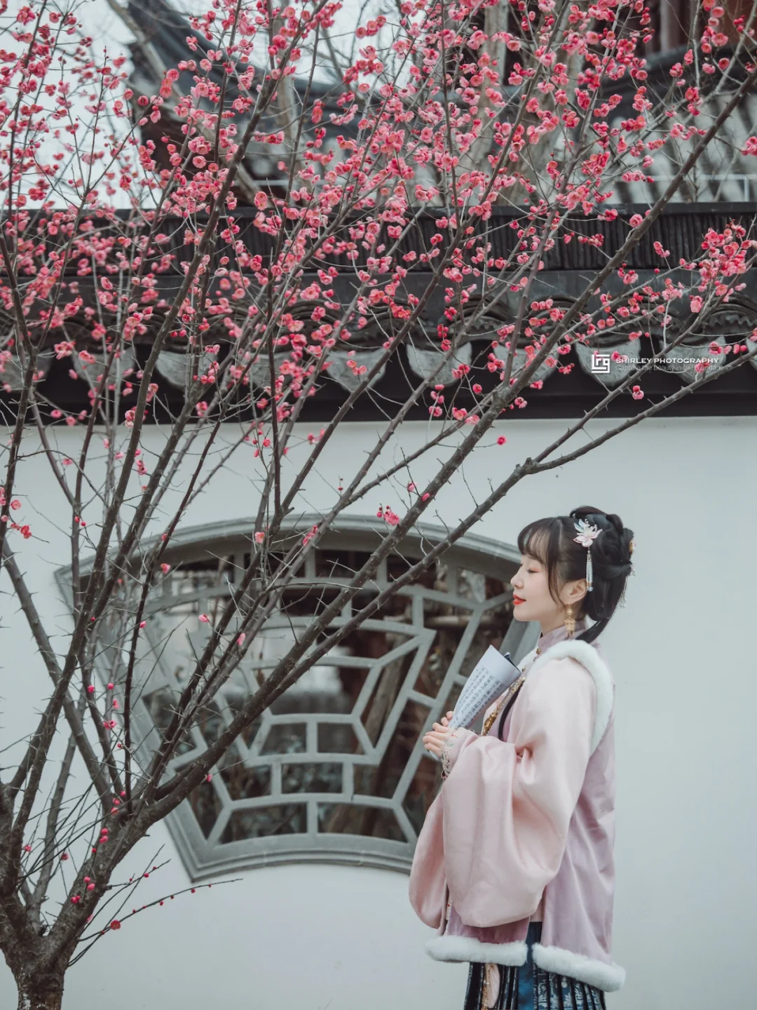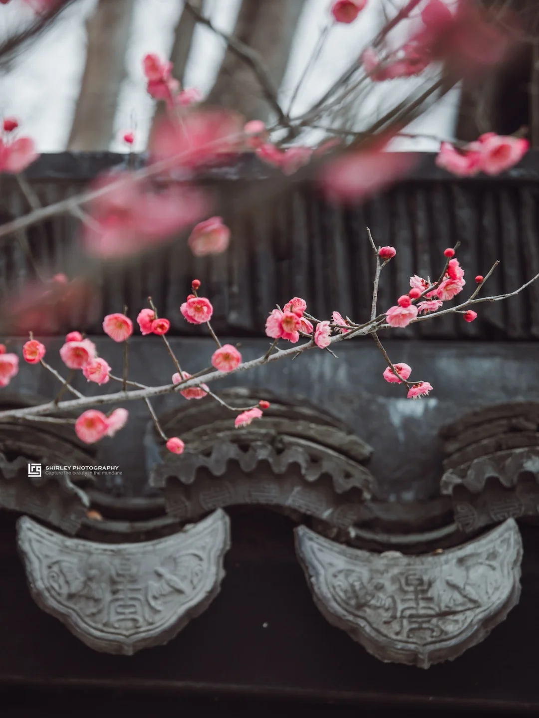 正是上海的赏梅时节,知道书院的院内、院外开满了一树树梅花。比起传统赏梅景点里的人潮汹涌,这里几乎空无一人。朵朵梅花绽放在枝头,配上江南风格的黛瓦白墙、古典院落,是整片水墨色系园林的最佳点缀。