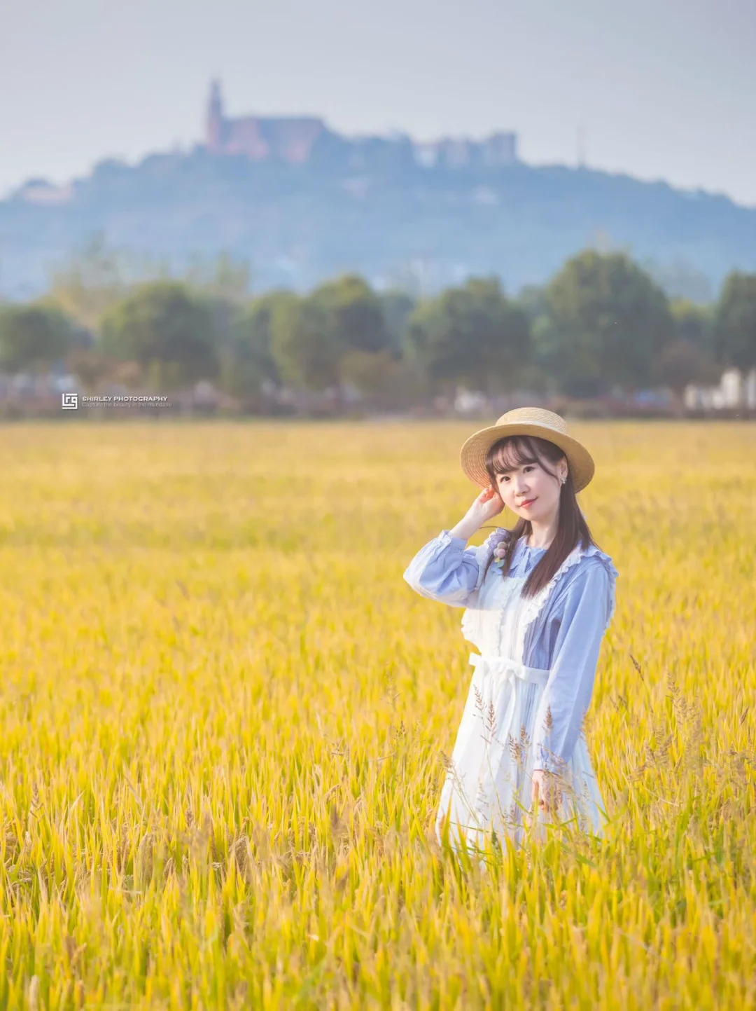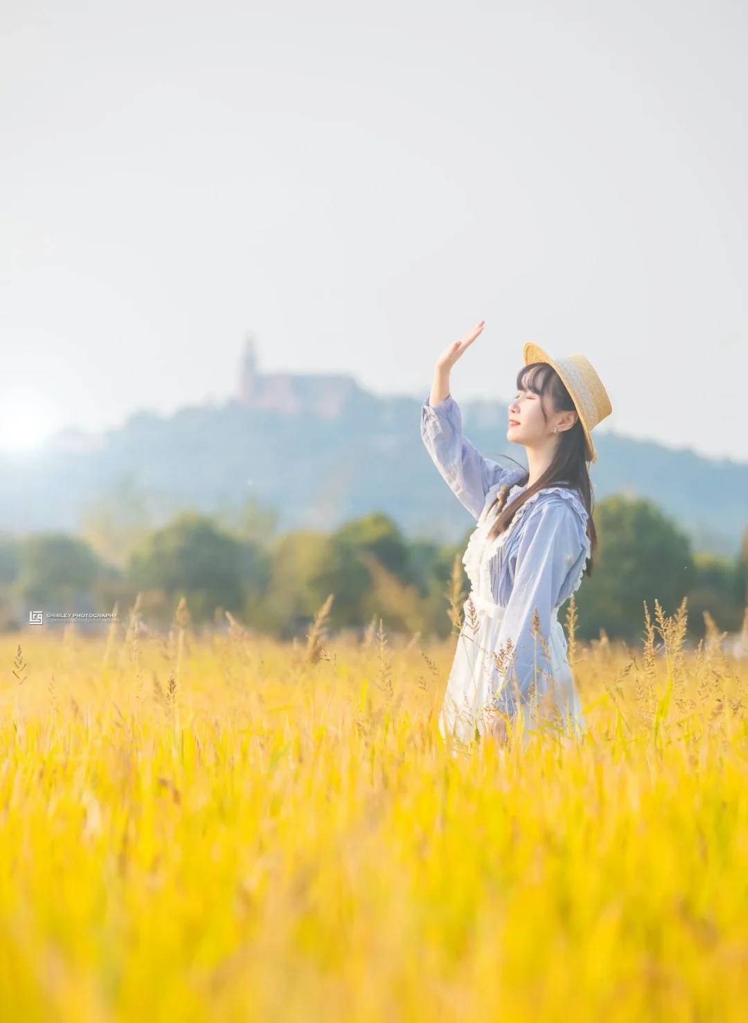 ▫️阳光下的金黄稻田与眼前的乡村小屋、以及远处的佘山组成了油画般的浪漫风景,第一眼令人叫绝!