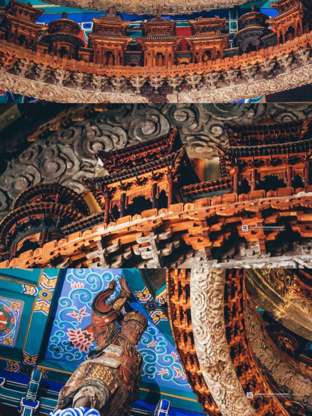🔹藻井布满了精雕细琢的天宫楼阁,仙人天女,四角有四大天王托举,雕刻绘画都异常精细,为明清建筑中得孤例。