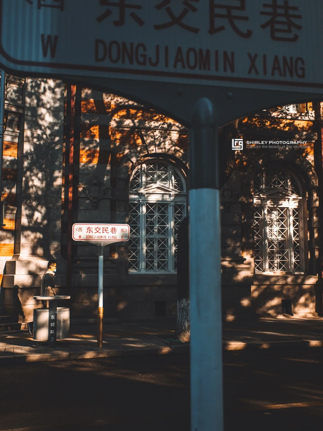 上午的光影给法院博物馆带来了非常强烈的明暗对比,建筑在太阳光照下闪烁着耀眼的光芒,连色彩饱和度都加重了一级。这幢建筑也是前来东交民巷打卡的游客们最热衷去的一处,就连建筑对面写着“东交民巷”的路牌也格外受欢迎。