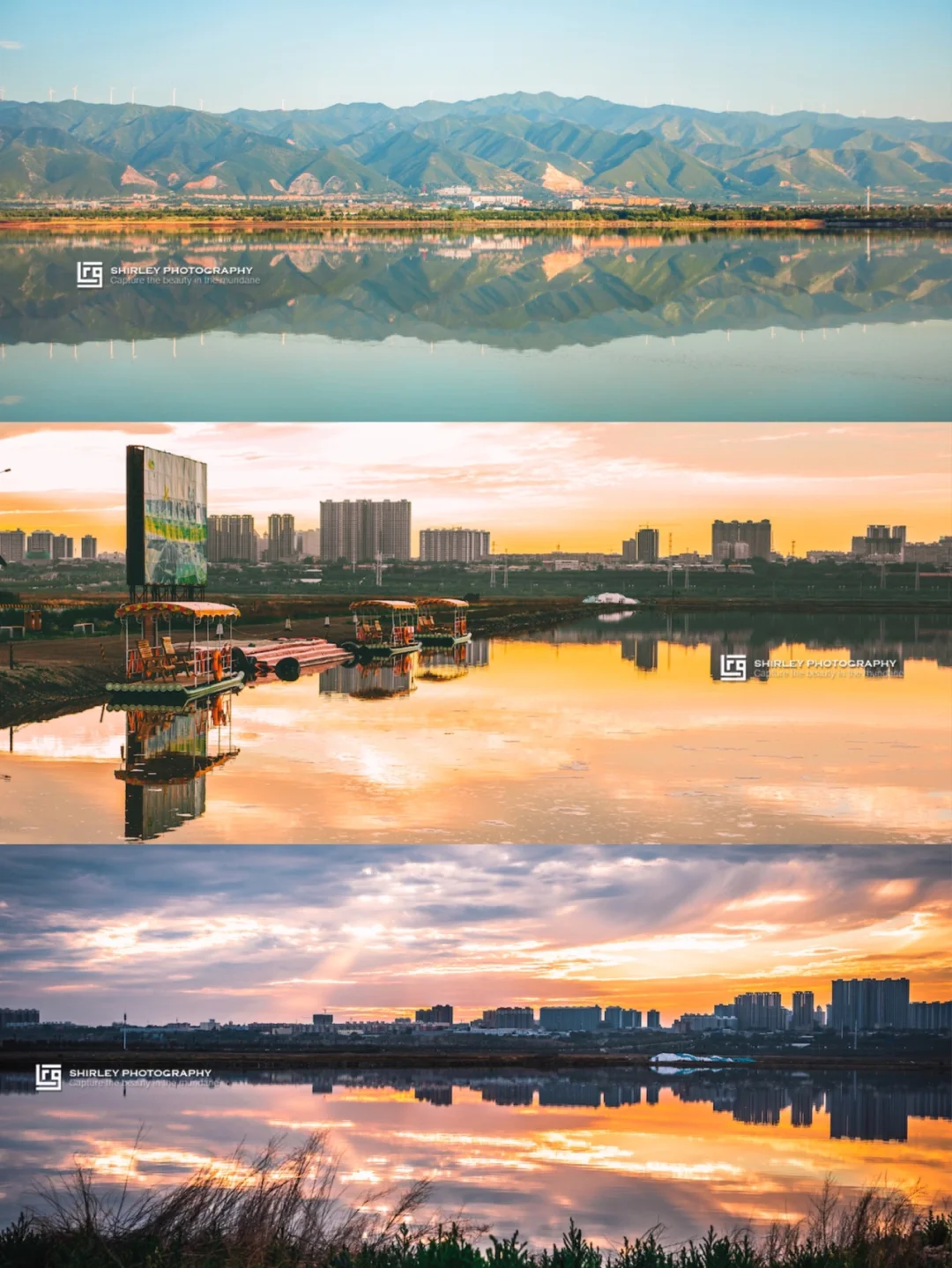 🔹黄昏时运城盐湖的落日也很美,盐湖的一侧是现代都市景色,一侧是绵延的中条山