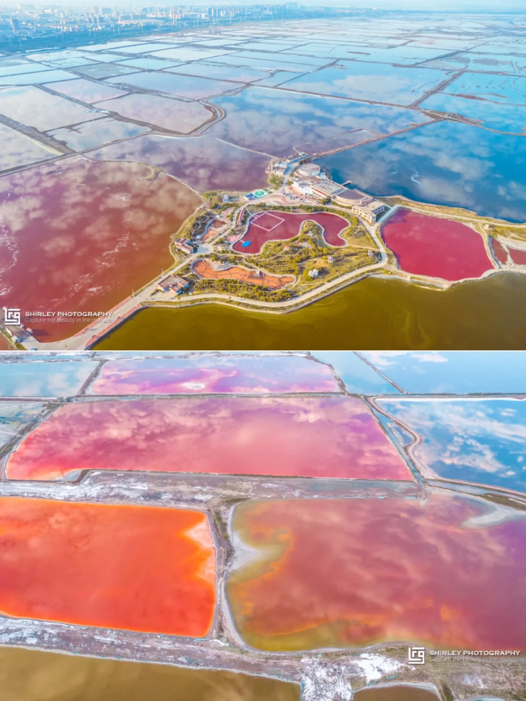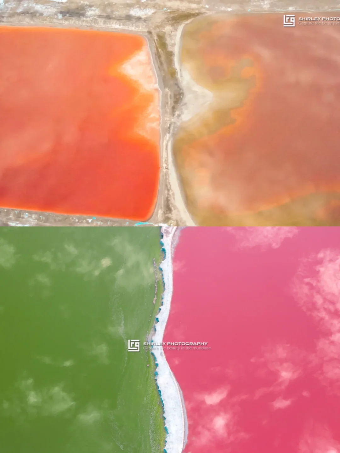 运城盐湖之所以会呈现那么多丰富的色彩,一是由于水分蒸发,湖水中钾钠等成分浓度不同而导致湖水变色,通常会显现红橙色;二是因为通常盐湖里都生长嗜盐绿色微藻,正常情况下使湖水呈绿色,当水质不良时这种微藻会产生血红素,把湖水染成红色或粉红色。