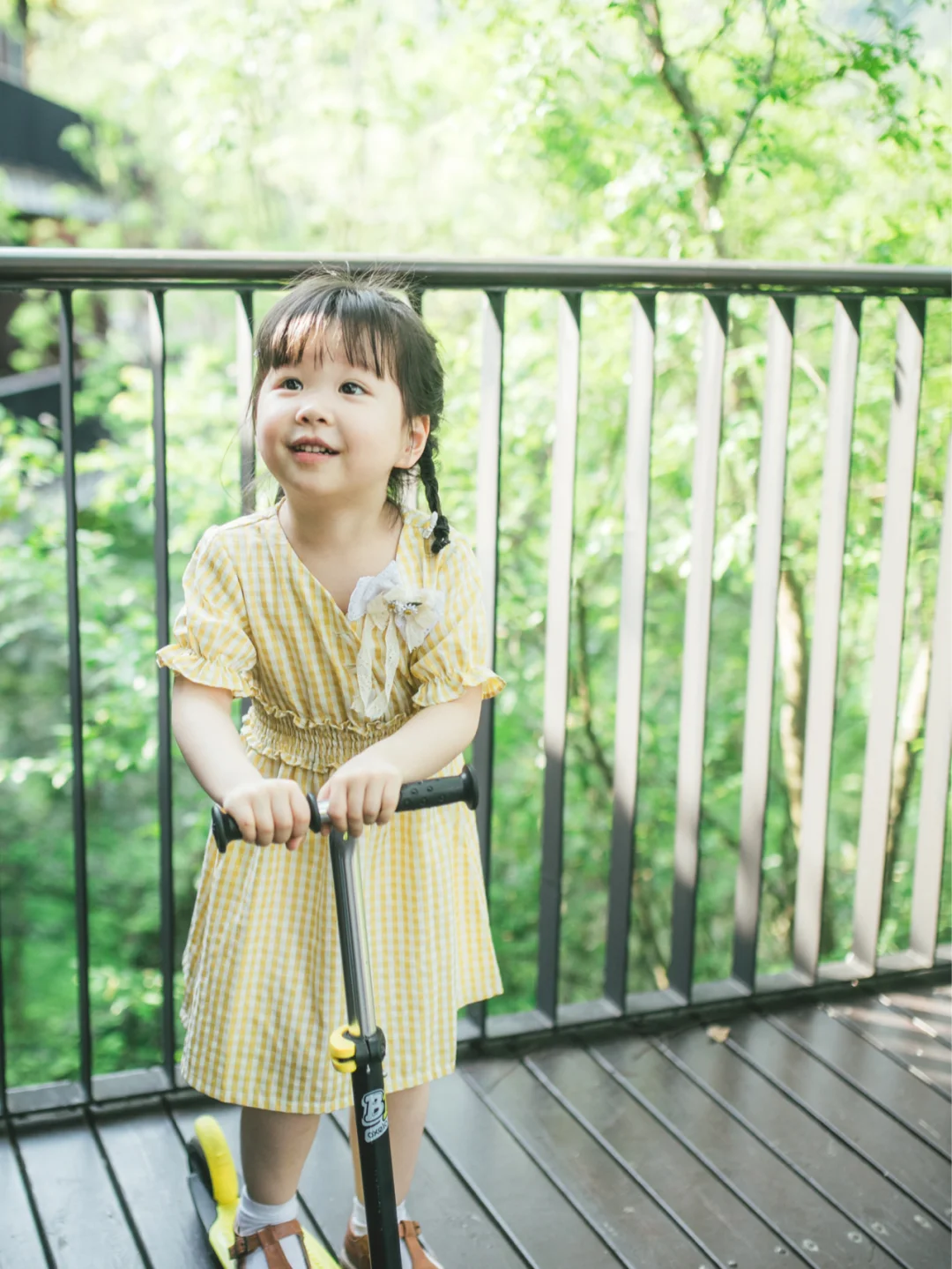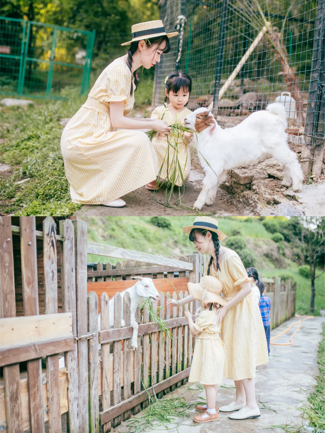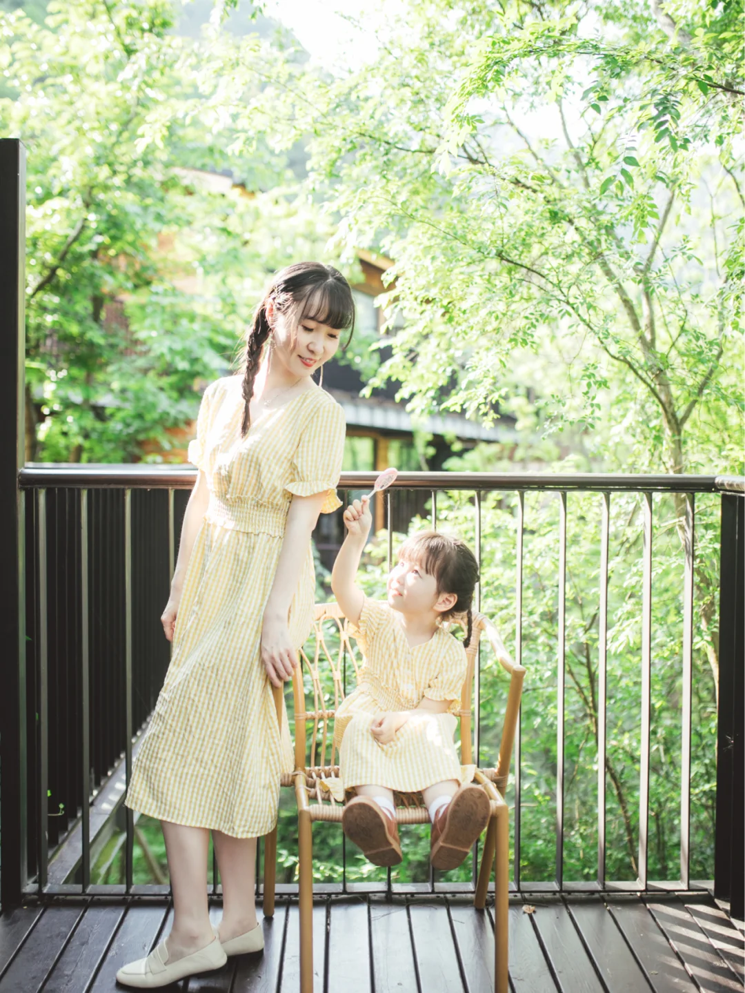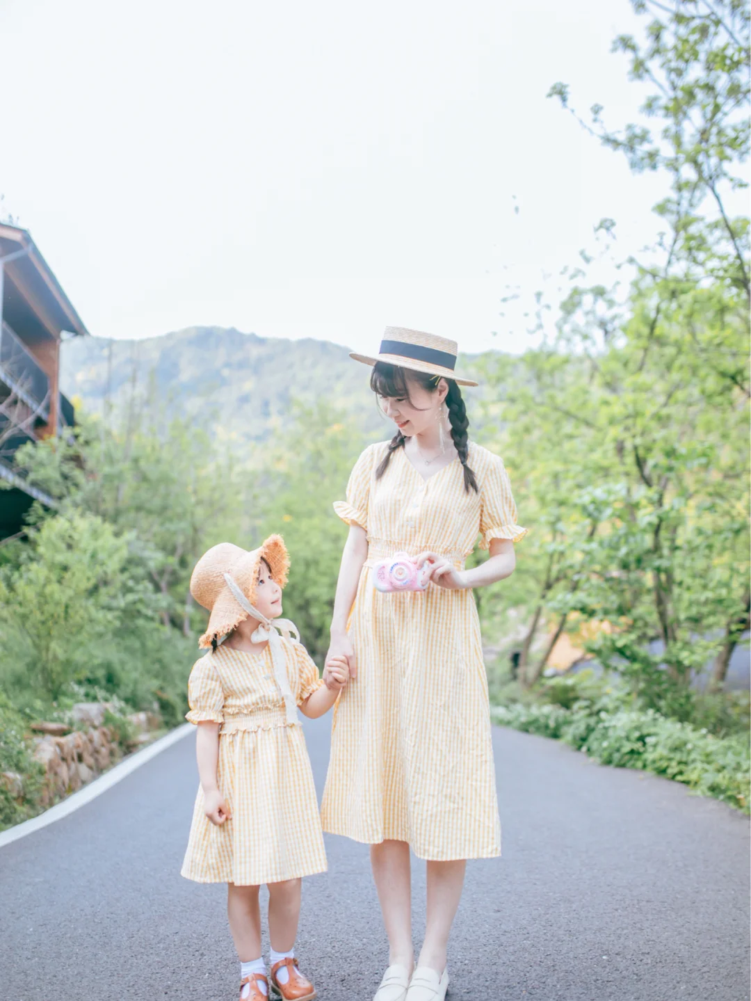 比较巧,最近的亲子旅行去的都是浙北的山里。浙北有许多竹林、茶园,湖泊,基本是森系又文艺的场景。我自己比较喜欢的是一套黄色格子的连衣裙,是我爱的清新风格,和绿色为主色调的场景特别搭。还有一套上衣是白底小樱桃图案,下身为红色半身裙。这套的高回头率倒是我没想到的,因为我和Suyi穿了一天这套衣服,酒店热情的工作人员对她印象深刻;都叫她Cherry小朋友,叫我Cherry麻麻…Emmm…