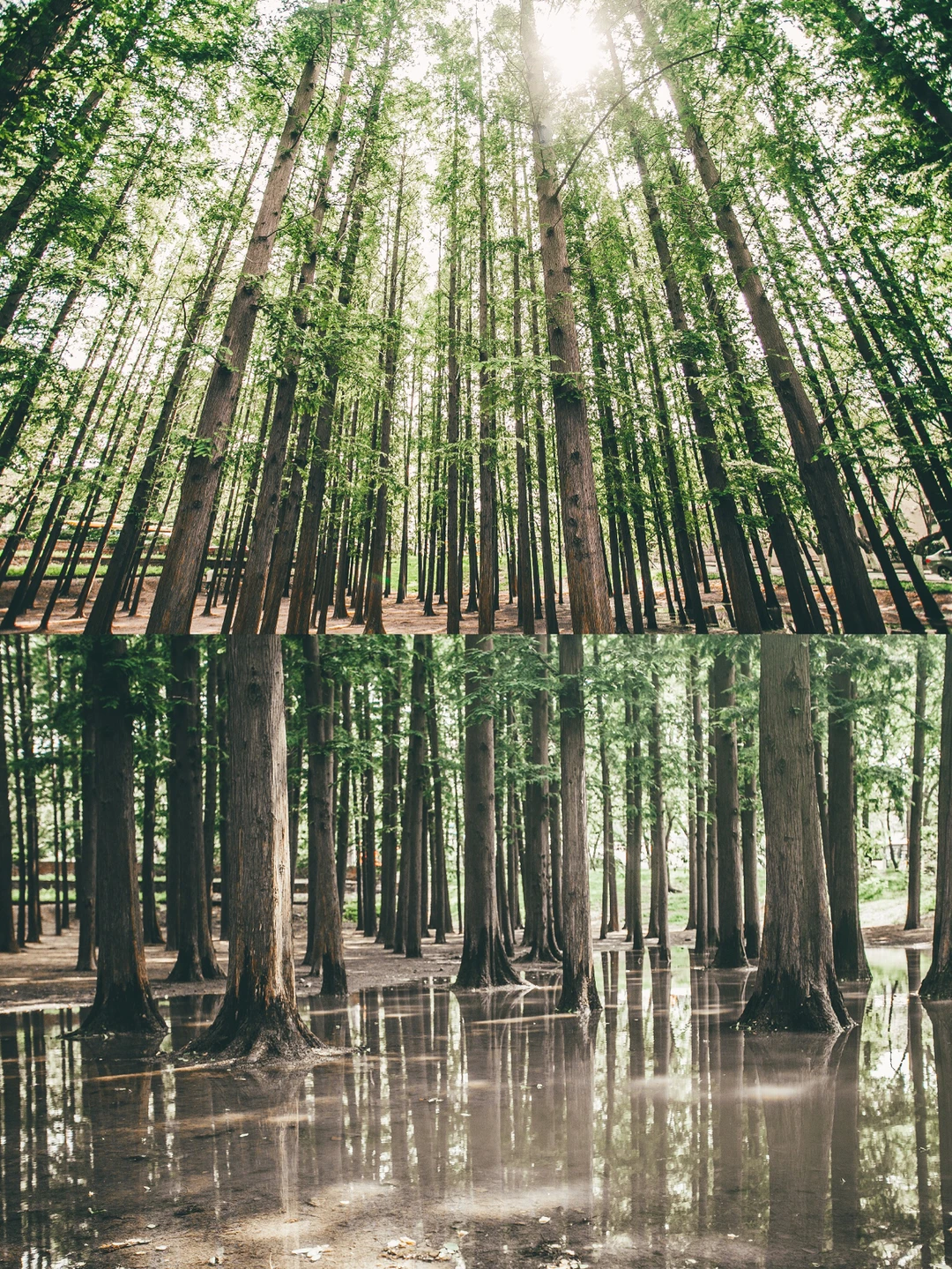 第一次来青岛时就发现的宝藏地方,靠近公交车站,这里有一片水杉林,积水时倒影特别美!