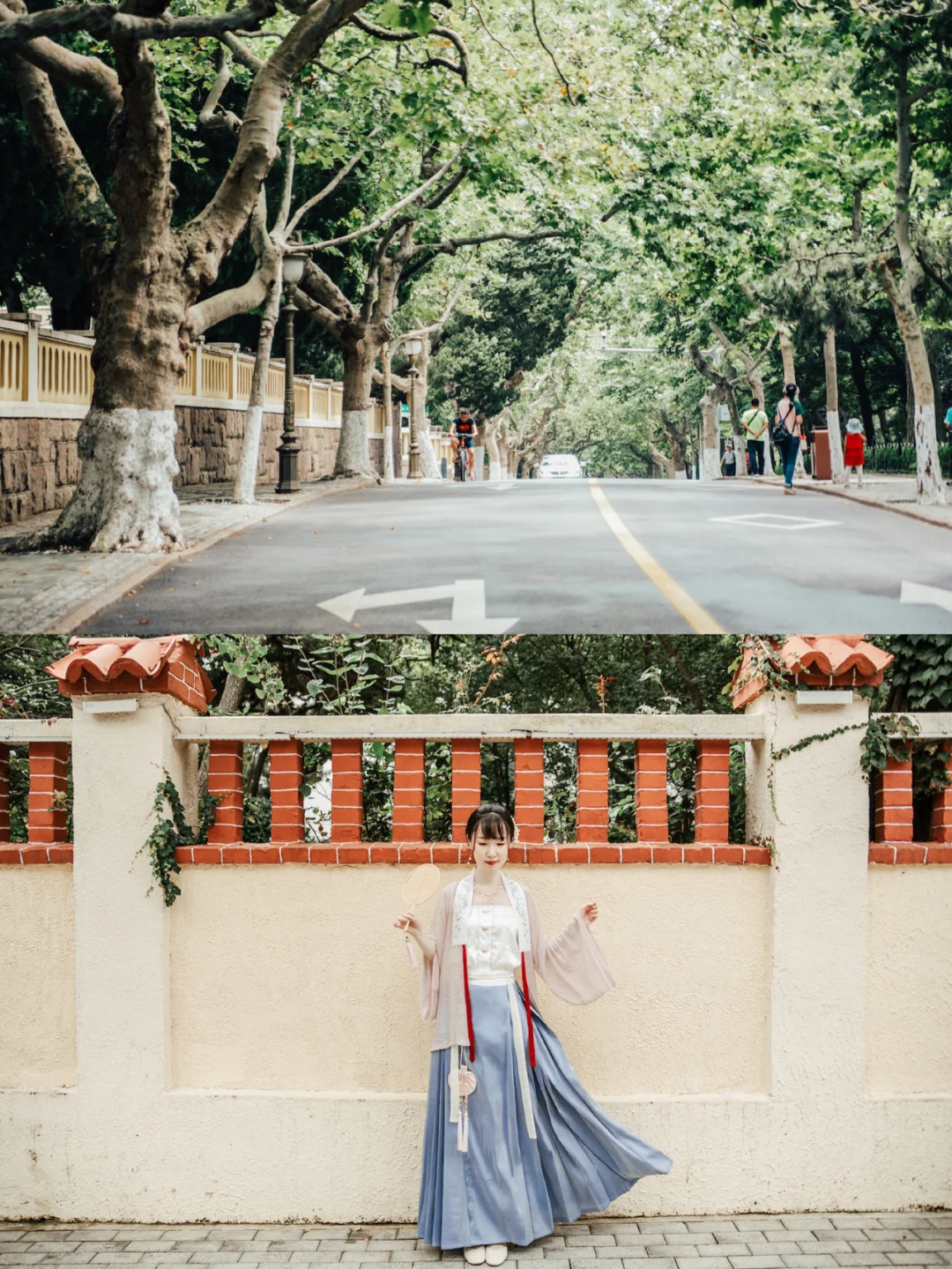 马路边的矮墙装饰着浅黄色的一根根柱子,似曾相识的镜头来自在此取景的网剧《最好的我们》,男女主推着自行车上下学的镜头。