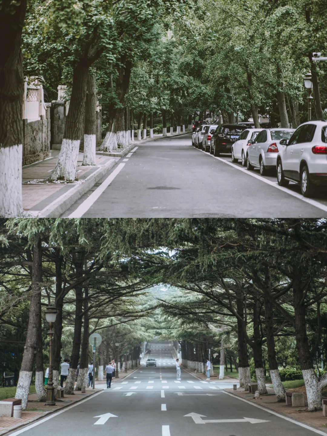 是景区内比较典型的一条马路,游人和摄影工作室来得不多。要拍马路照可以选这里,适合用长焦拍摄压缩出林荫道的深邃感,很有青岛的感觉。听说秋景也很美