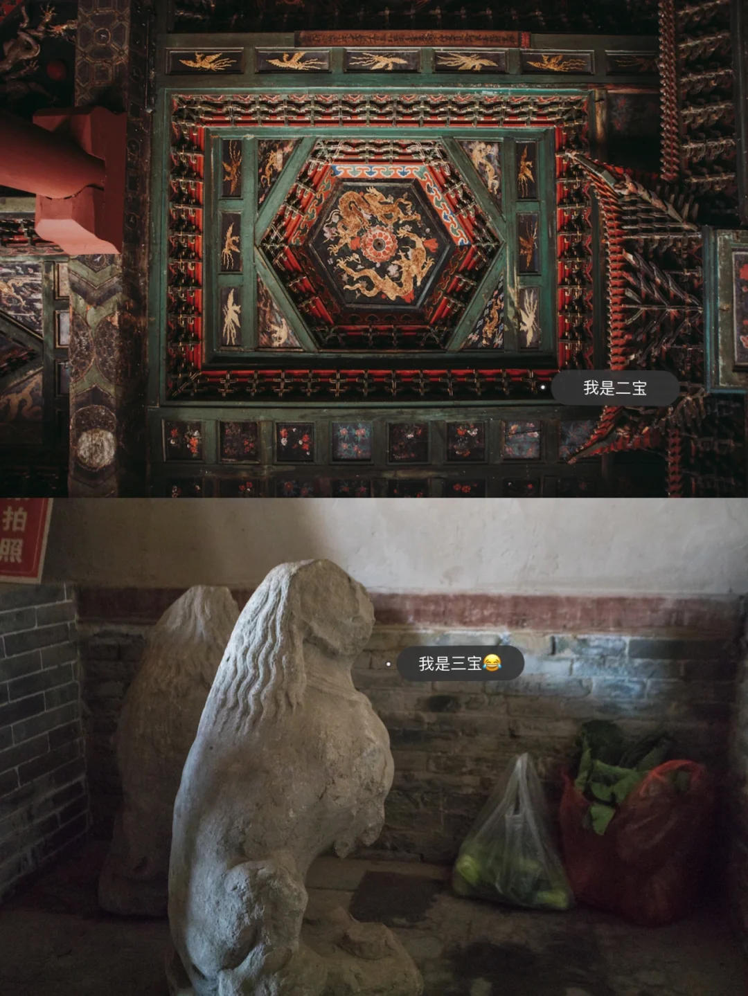 在幽暗的角落里发现了应县最后一宝,被蔬菜袋子包围的小狮子看上去弱小无助又可怜。披头散发确实比我们以往看到的螺髻狮子更“清新脱俗”,被梁思成考证为辽代文物。可惜经历了十年运动,它们比梁思成的照片更为残破了。