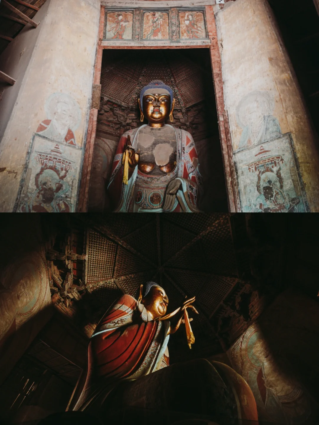 随着大门打开,我们也走进了800多年前的世界。虽然大殿内的佛像是后人作品,但最惊人的却是头顶那让人久久仰望的天宫楼阁小木作,当心间的藻井最为繁复精美,美到让人叹气。