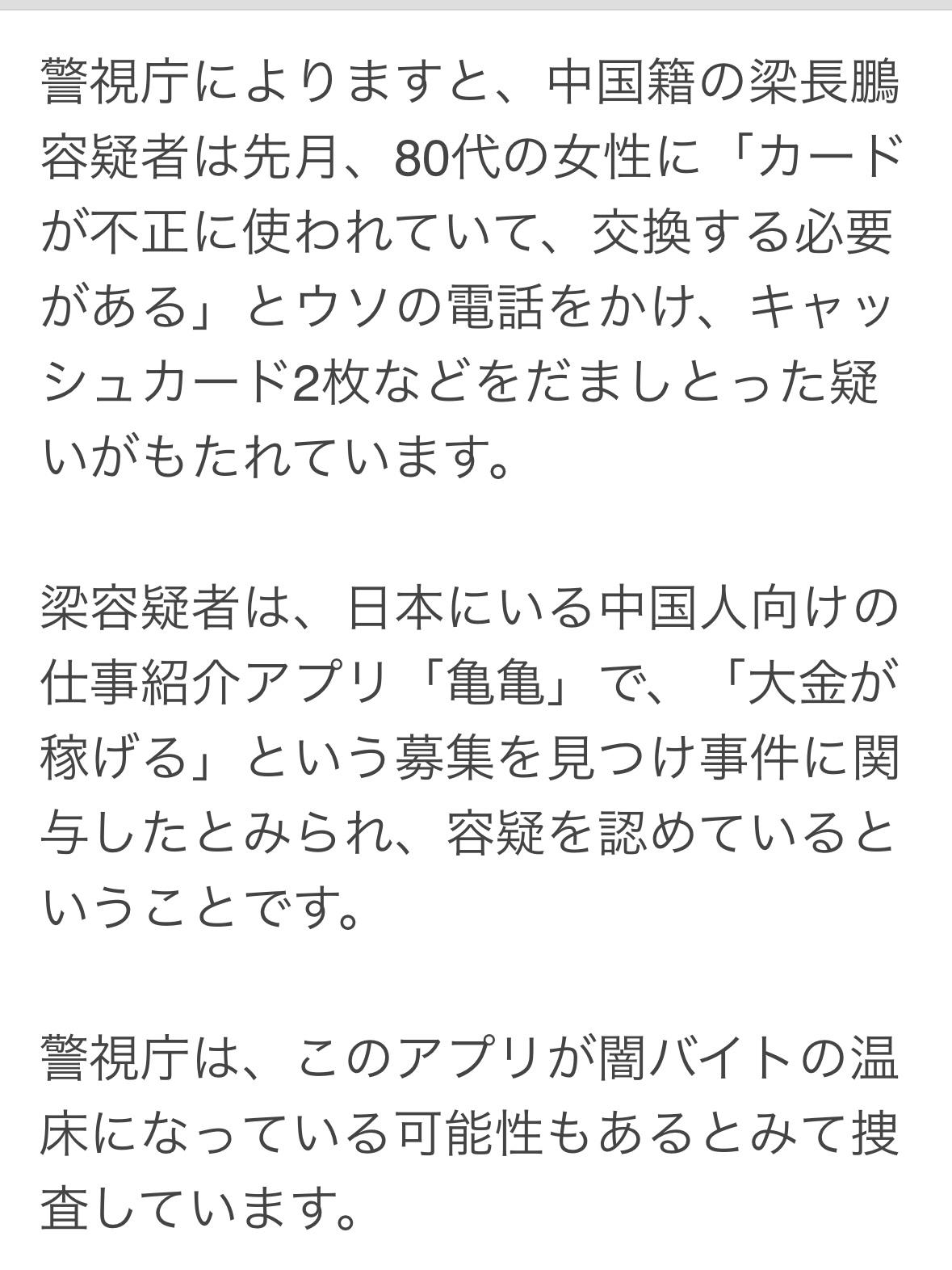 32岁中国人梁某,给80多岁日本女人打诈骗电话,谎称银行卡被人盗用必须更换,骗走了两张银行卡。 事件的线索来自声称能赚大钱,为在日中国人介绍工作的软件"龟龟",警察顺藤摸瓜找到了梁某。 真有大钱可赚,还用得着上网募集!能赚大钱的工作也许只有诈骗……
