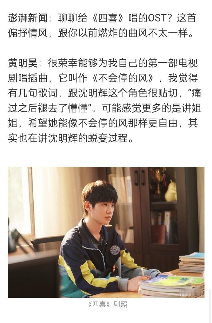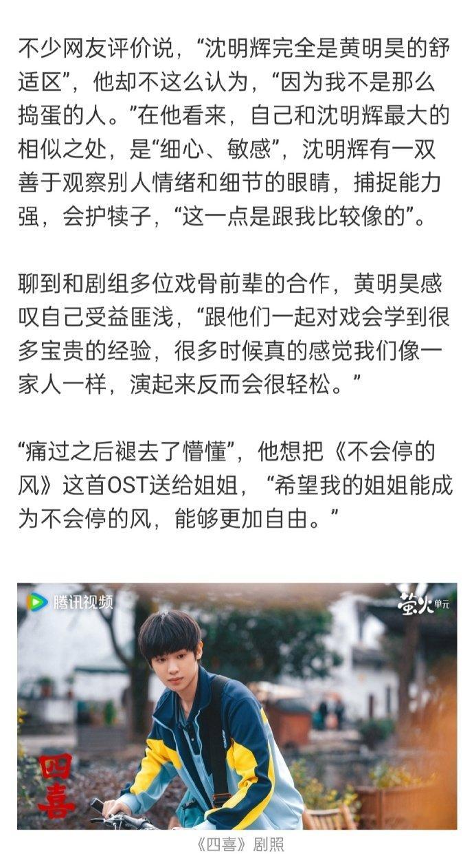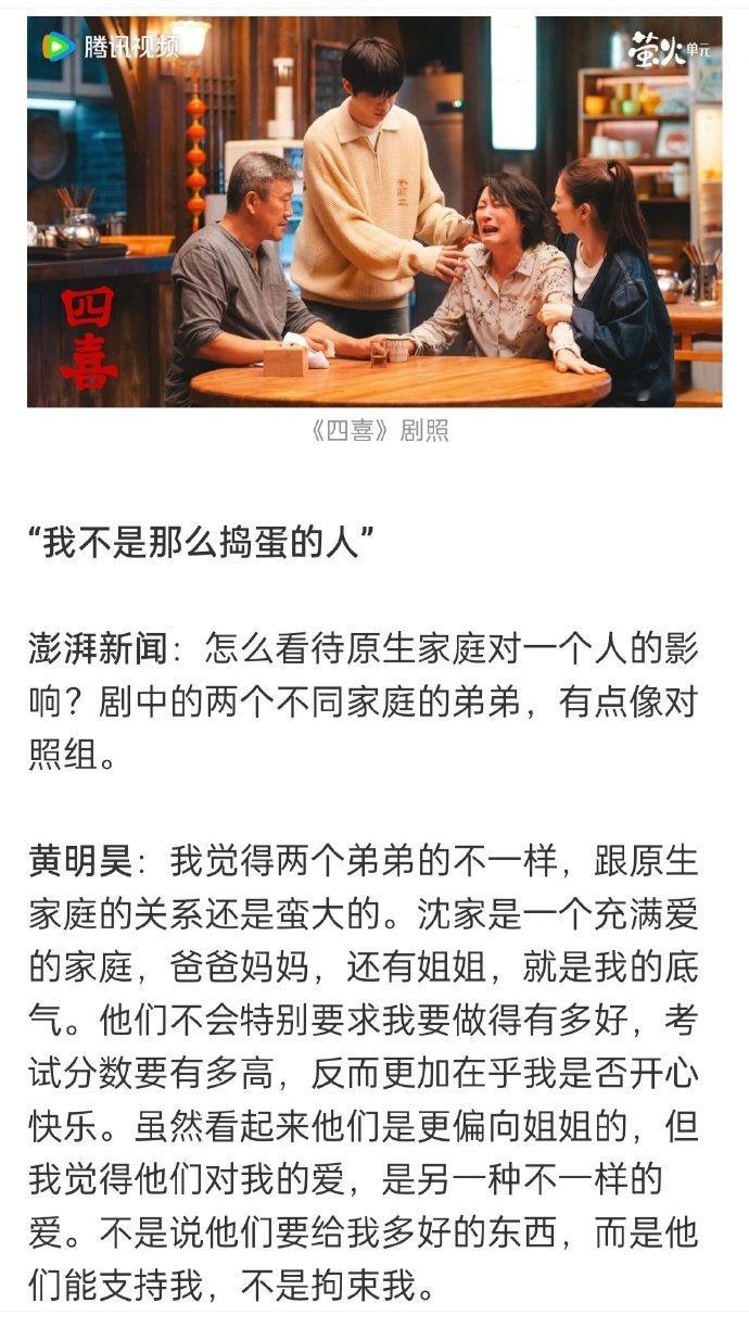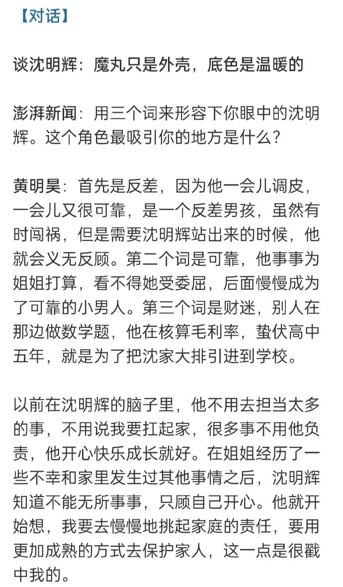 黄明昊《四喜》文字专访中否认了出演沈明辉是在自己舒适区的说法,认为自己没那么捣蛋,但在“细心、敏感”等方面和角色还是有相似之处的。黄明昊说魔丸只是沈明辉的外壳,他的底色是非常温暖的~很开心能看到小贾饰演的沈明辉,一起期待后续剧情吧~