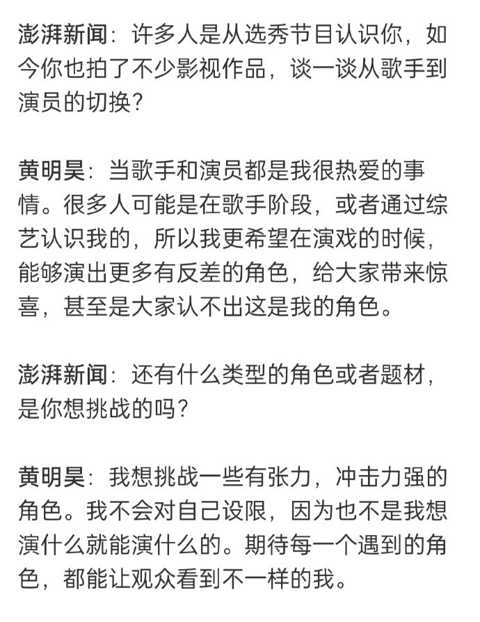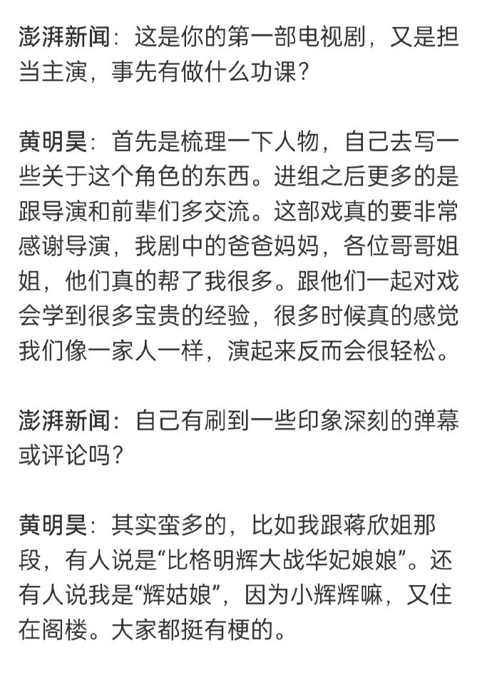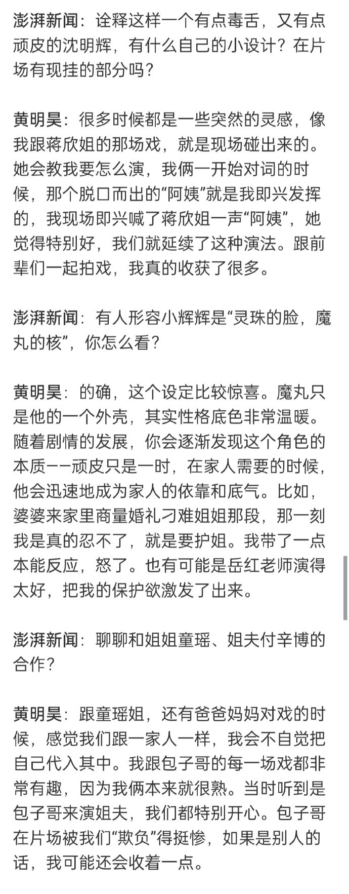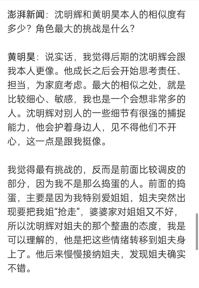 黄明昊《四喜》文字专访中否认了出演沈明辉是在自己舒适区的说法,认为自己没那么捣蛋,但在“细心、敏感”等方面和角色还是有相似之处的。黄明昊说魔丸只是沈明辉的外壳,他的底色是非常温暖的~很开心能看到小贾饰演的沈明辉,一起期待后续剧情吧~