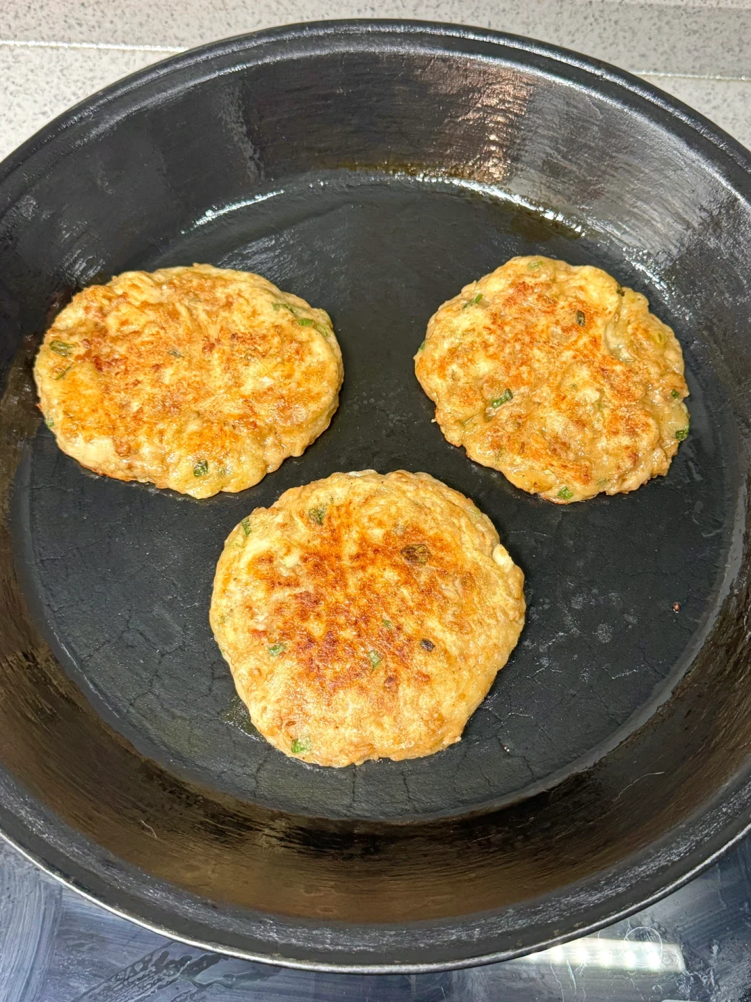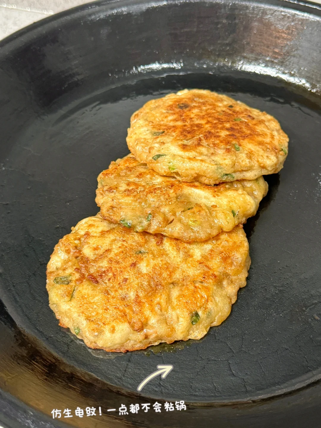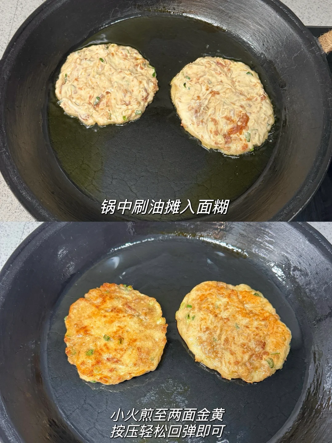 3️⃣调好的肉馅加入面糊中搅拌均匀,锅中刷油摊入面糊,小火煎至两面金黄,按压轻松回弹即可