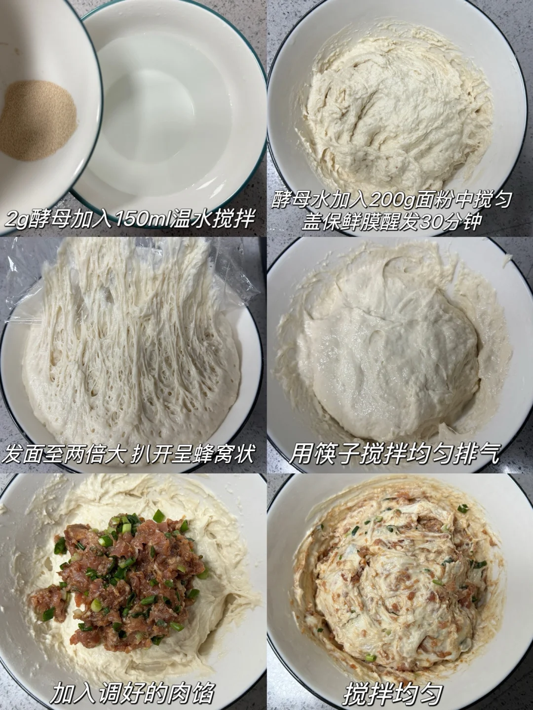 1️⃣酵母加入温水搅拌均匀,再倒入面粉中搅拌至无干粉状态,封上保鲜膜醒发30分钟,面团醒发至2倍大,用筷子搅拌均匀排气