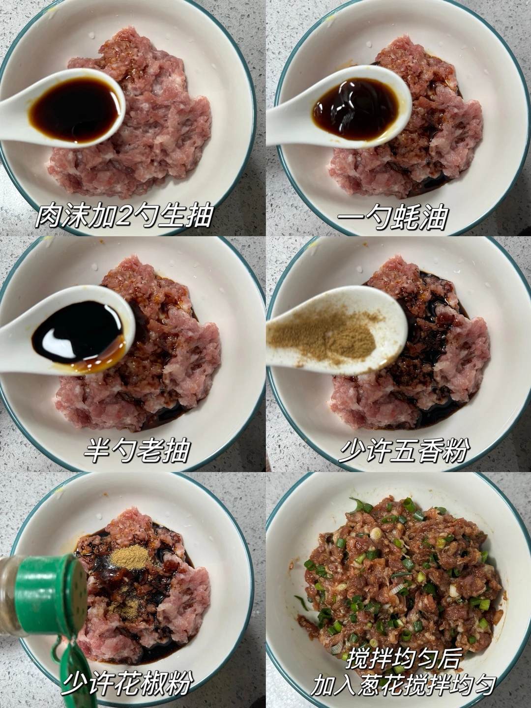 2️⃣肉馅中加入2勺生抽、一勺蚝油、半勺老抽、少许五香粉、少许花椒粉,搅拌均匀后再加入葱花搅拌均匀