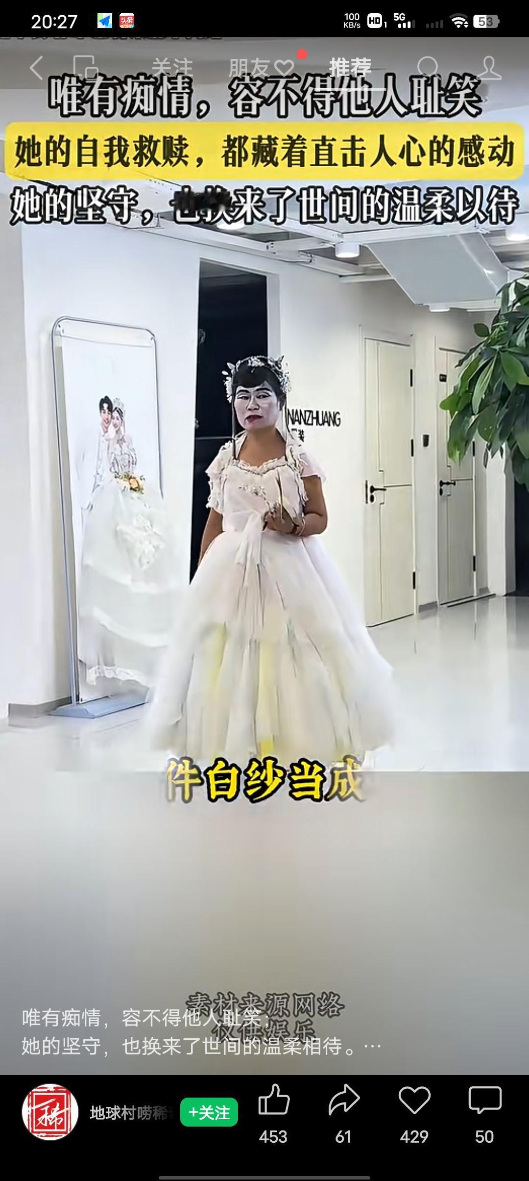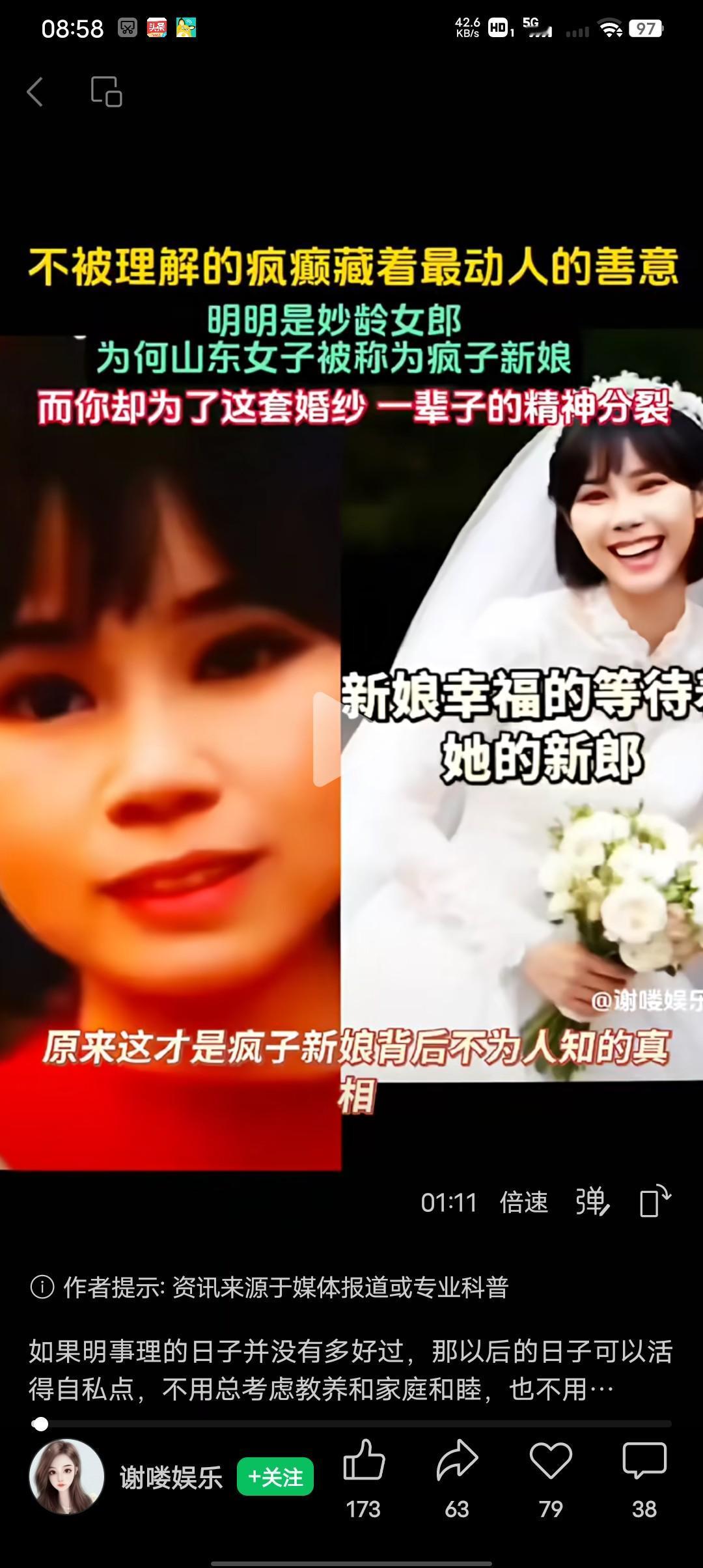 她死在了她最幸福的那天! 最近总刷到这样一个让人破防的真实故事。原来这才是疯子新娘背后不为人知的真相,山东东明县的街头,总有一位被称作“疯子”的新娘。她身穿婚纱,画着夸张的妆容,她穿着自己挑选的婚纱,想着能穿给自己喜欢的人看。当她穿着洁白的婚纱等着自己的爱人迎娶自己的时候。一场突如其来的车祸,让她的爱人死在了迎接她的路上,当她奔向她的爱人的时候,她的爱人已经浑身是血的死在了她的眼前。 于是,她身上的婚纱便成了她余生的执念,每当有迎亲的车队路过,她就静静的待着不吵不闹,希望她也能等到那个曾经也答应来迎娶她的人。她的余生都被困在了那场车祸中,也被困在了那场婚礼中,原来是有痴情的女子,还是这样的痴情。 她的痴情等来了别人的祝福,有对新人邀请她做他们的伴娘,她的回答却让人破防“不行,我不吉利的,我不能带给你祝福好运” 也许她看着别人幸福,她想着自己也能等到那个说娶她的人,她还在等,等属于她的婚礼,等那个爱她的人重新出现。我们可以笑任何疯癫,唯独笑不了痴情!