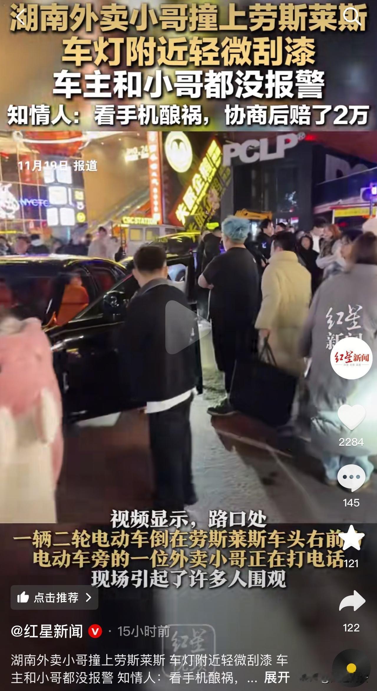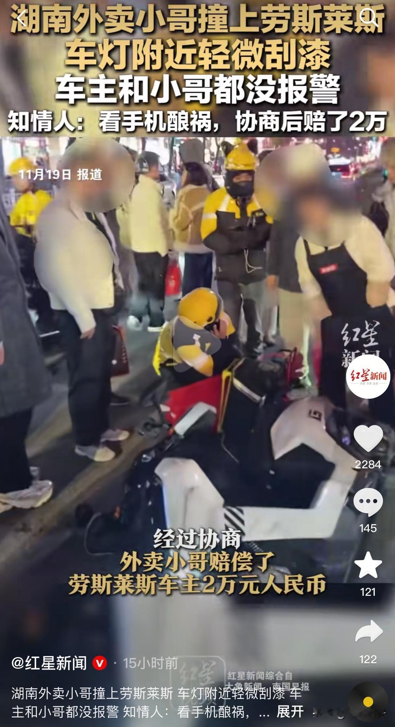 这下外卖小哥赔大了!近日,湖南长沙一外卖小哥撞上了劳斯莱斯,最后赔偿了2万。网友
