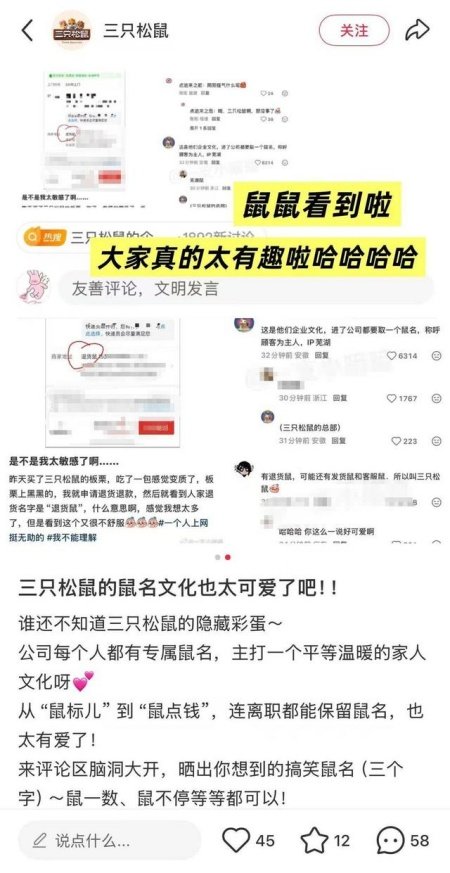 随着话题不断发酵,三只松鼠方面注意到此事,并透过官方社交媒体回应道,“是谁还不知道三只松鼠的隐藏彩蛋?公司每个人都有专属鼠名,主打一个平等温暖的家人文化呀!从‘鼠标儿’到‘鼠点钱’,连离职都能保留鼠名,也太有爱了!”
