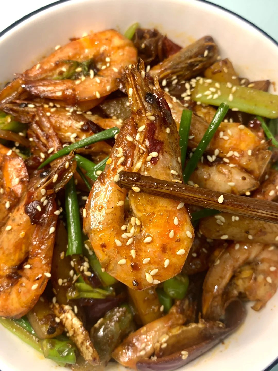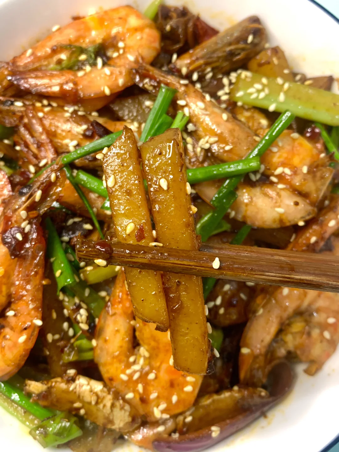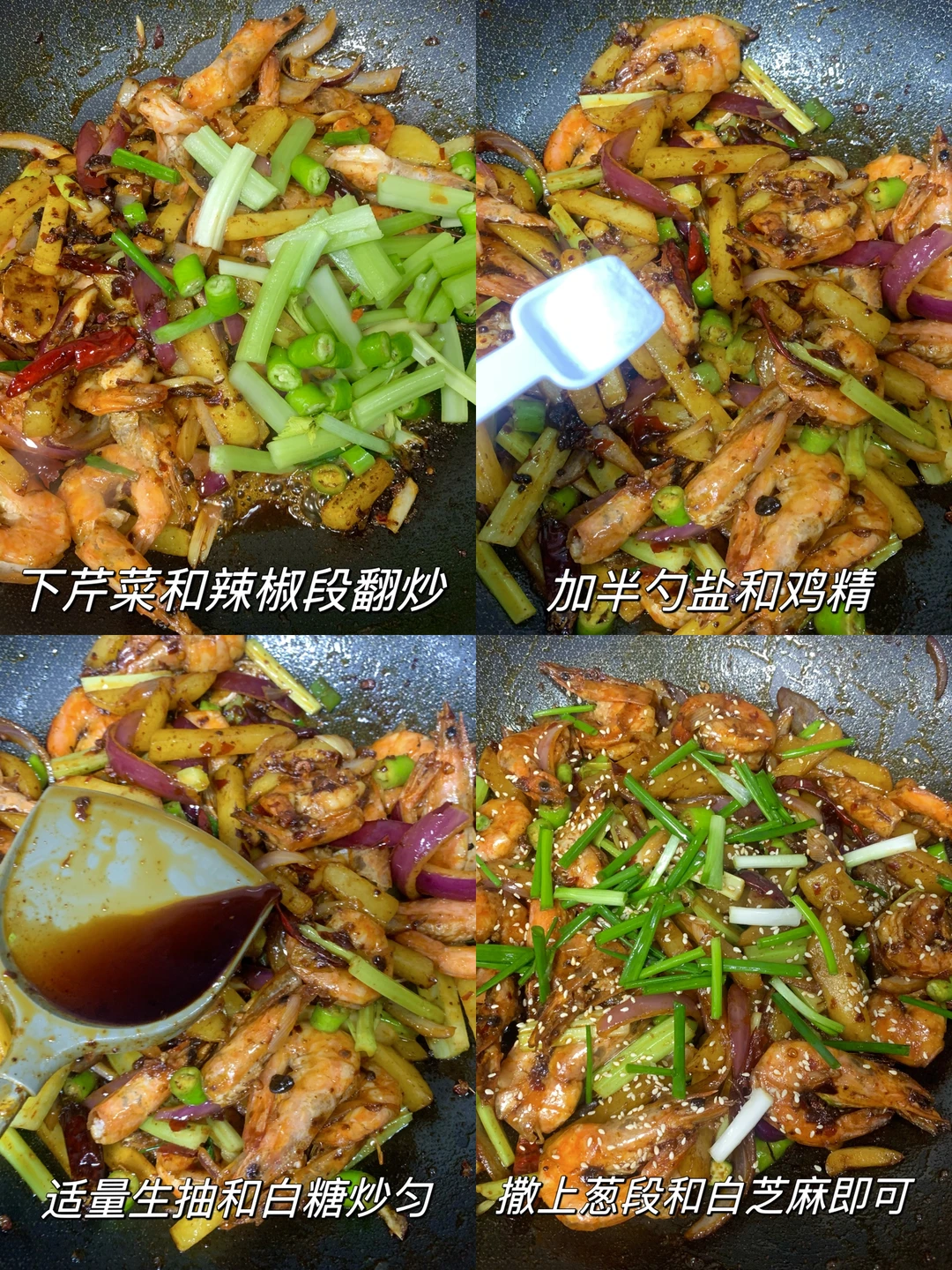 4⃣️倒入大虾和土豆翻炒均匀,加芹菜和辣椒段翻炒几下,加半勺盐和鸡精、一勺生抽、少许白糖炒匀,撒上葱段即可~