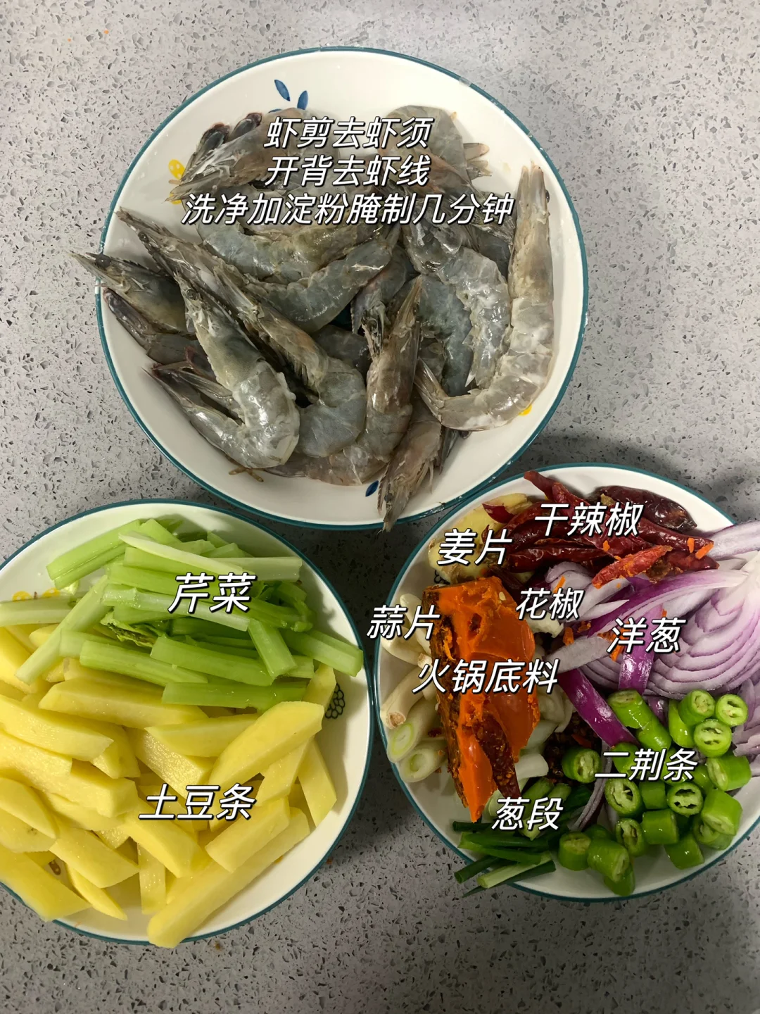 食材:基围虾、土豆、火锅底料、洋葱、芹菜、小葱、姜、蒜、花椒、干辣椒、线椒