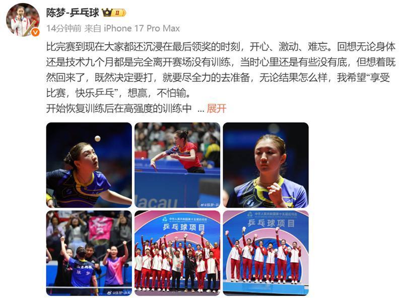 山东女团夺冠,陈梦发了一条很长很长的微博! 11月20日,全运会乒乓女团赛事落幕,山东队以总比分3-2险胜河北队夺冠,这是她们时隔12年后,再度问鼎该项目的冠军,一晃,已多年。 12年前,李晓霞是领军人物,陈梦还是小小的,如今,梦姐早已是队伍王牌,在决赛中独得2分撑起了一片天。 所以,时光辗转,当昔日荣光再现时,梦姐难免感慨,难免会思虑万千;所以,在平复了万分激动的情绪后,她发了一条很长很长的微博,诉说了内心的种种,很少见,很动情,也很用心。 梦姐首先提到的就是,这次全运之旅就像做梦一样,毕竟她已9个多月没系统训练,对自己的状态和技术都没底,结果没想到竟拿了一金一铜,这真的出人意料,也非常惊喜,直到现在还觉得不真实,还沉浸在颁奖的喜悦中。 接着,梦姐又透露了自己的备战历程,她直言高强度的训练很辛苦,自己每天都在咬牙坚持,不能放松,她想为山东队再做出些贡献,也想通过自己的坚持和努力,去影响更多的年轻人,把山东女团的乒乓精神继续传承下去。 随后,回顾这次的全运比赛过程,梦姐用“圆满”和“不可思议”来形容,“圆满”是因在自己的第5次全运征程中拿到这个成绩,她已非常满意,生涯也已知足。 “不可思议”则因每场比赛都十分艰难,好几次都处在了淘汰边缘,但凭借顽强的意志和团队给予的力量,她们最终都坚持了下来,还在决赛中惊险获胜,这真是一段神奇的旅程。 最后,梦姐也向所有支持自己的人表达了感谢,也感叹了竞技体育的残酷性,毕竟冠军只有一个,有赢就有输,同时,她还告诉了我们一种心态和一个道理,那就是: 享受比赛,热爱比赛,想赢,但不怕输的心态。 只要你努力不放弃,无论什么时候都可能有奇迹发生的道理。 希望我们也能拥有这种心态,明白这个道理,也不得不感叹,生涯数十载,陈梦夺冠无数,但这一冠更特别,更难忘,而通过梦姐的这一段神奇经历,我们也知道了: 冠军就是冠军,即使接近“退隐”,她仍能用百倍努力和“厚厚的底子”战胜多数人,打出自己的特点和风采。
