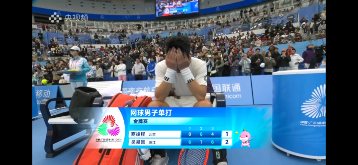 杭州运动员吴易昺首次打进全运会网球男单决赛,面对北京选手商竣程,首盘仅耗时35分钟便以6比0轻取对手,第二盘,商竣程状态复苏,又以6比1扳回一盘。决定胜负的第三盘,两人都卯足了劲,最终吴易昺以6比4取胜,总比分2比1拿下这枚金牌。