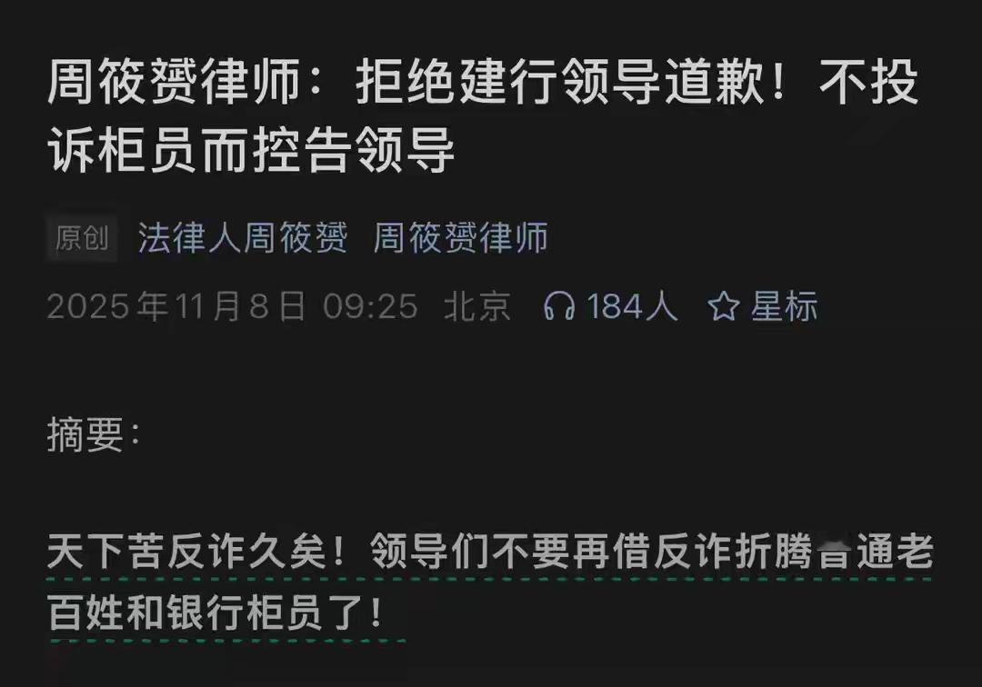 “央行规定5万,建行加码到1万”?律师取钱被追问用途 已拒绝建行道歉,并控告违法行为 这是一则令人震惊的新闻,也折射出我们当下社会中隐隐浮现的信任危机。央行规定存款上限5万元,建行竟然“加码”到1万元,这背后到底隐藏着怎样的逻辑?更令人心寒的是,律师在取钱时竟然被追问用途,甚至被拒绝,面对银行的“刁难”,他果断拒绝道歉,并且选择控告这种“违法行为”。这件事,似乎不仅仅是银行的操作问题,更像是一面镜子,映照出我们对个人隐私、金融安全甚至法律底线的担忧。 银行作为金融体系的守门员,本应是保护客户权益的第一线,但当规则变得模糊、执行变得随意时,谁还能相信?这次事件中,律师作为专业人士,理应享有基本的权益和尊重,却被追问用途、被拒绝取款,这背后是不是隐藏着某种“潜规则”?如果连律师都不能在银行里享受到应有的尊重和保护,那么普通人又该如何在这个体系中找到安全感? 更令人深思的是,银行的“加码”行为,似乎在无形中增加了公众的疑虑。难道银行在执行央行规定时,暗中设了“门槛”?还是说,这背后隐藏着某些利益博弈?当公众的信任逐渐被侵蚀,我们的金融环境还能否健康发展?这不仅是个别事件,更像是一个警钟:在快速变化的金融时代,规则的制定和执行必须透明、合理,否则就会引发更多的不安。 从人性的角度来看,这件事激起了公众对“公平”“正义”的共鸣。我们都希望在这个社会中,规则是公平的,法律是公正的。可是,当银行的行为被质疑、被控诉时,公众的信任也在一点点流失。我们渴望一个既有制度保障,又有人性关怀的金融环境,而不是充满“潜规则”的灰色地带。 这起事件让人不禁反思:在追求效率和利益的同时,我们是否也应该守住那份底线?银行作为金融守门人,是否应该成为守护者而非“设卡者”?我们期待的是一个透明、公正、尊重个人权益的金融环境,而不是被“套路”和“刁难”绑架的未来。 这不只是一场关于存款的争执,更是一场关于信任与尊重的考验。你怎么看?你是否也曾在银行遇到过类似的尴尬和不公?欢迎留言分享你的故事,让我们一起呼吁,重建那份应有的信任和尊重!银行新规 建行存款