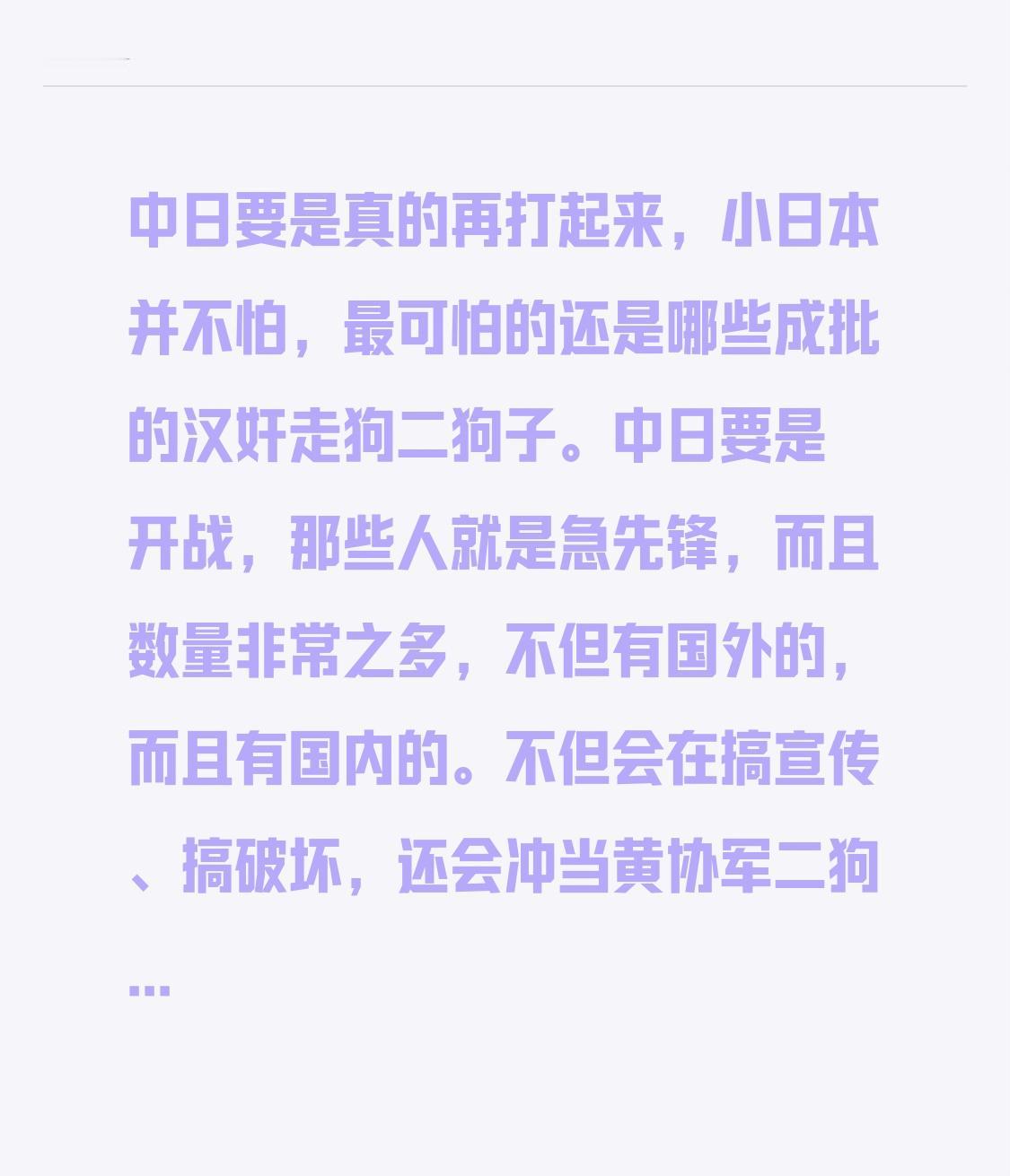 中日要是真的再打起来,小日本并不怕,最可怕的还是哪些成批的汉奸走狗二狗子。中日要是开战,那些人就是急先锋,而且数量非常之多,不但有国外的,而且有国内的。不但会在搞宣传、搞破坏,还会冲当黄协军二狗子。绝不能轻看这批人,稍有不慎就露出来了,国家应该启动除奸队,把这批汉奸间谍深挖,彻底铲除?