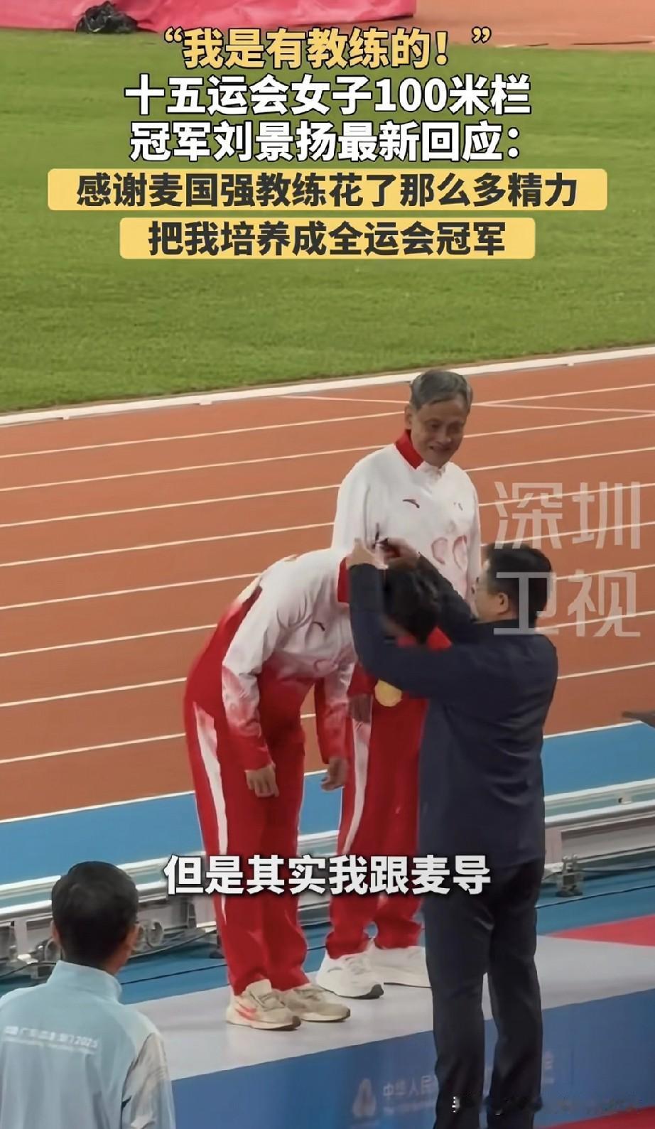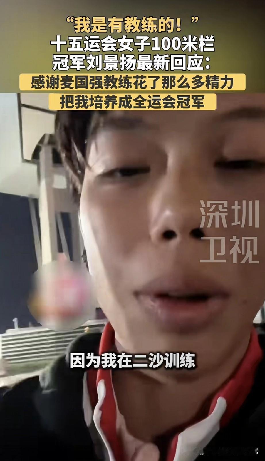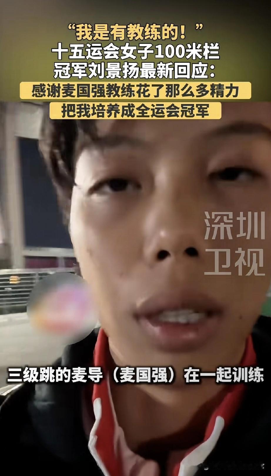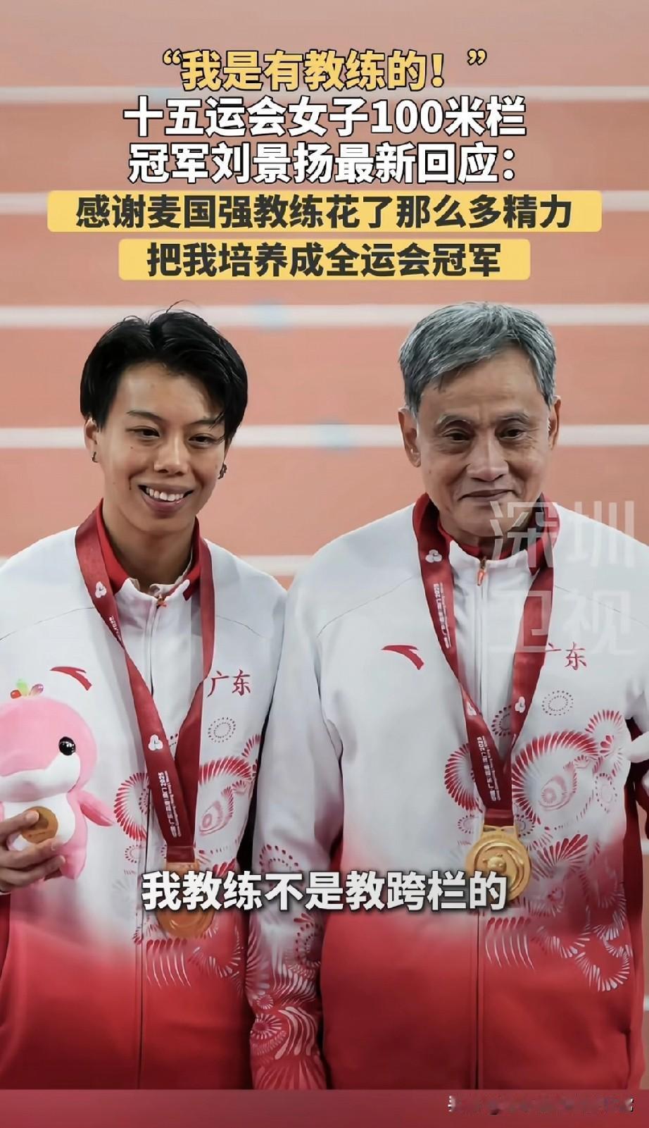 100米栏冠军刘景扬急了,我有教练! 刚拿十五运会100米栏冠军的刘景扬,对着镜头哭笑不得:“有人说我没教练,我妈可能不太了解——我跟麦导(麦国强)练了四年!” 更绝的是,麦教练压根不是教跨栏的,是练三级跳的! 这事儿直接给网友整懵:“等于数学跟体育老师学,拿了奥赛第一?” 有人夸“这师徒俩是天选组合,实力碾压专业配置”,也有人皱眉头“跨栏找三级跳教练,这操作到底是运气还是不专业?” 你看这冠军+“外行”教练的搭配,拿了金牌还得辟谣——是不拘一格的天赋胜利,还是项目训练的“野路子”? 现在吵翻了:“能赢就是硬道理”VS“专业的事该交给专业人”——你说,这种“跨界师徒”到底该不该提倡?
