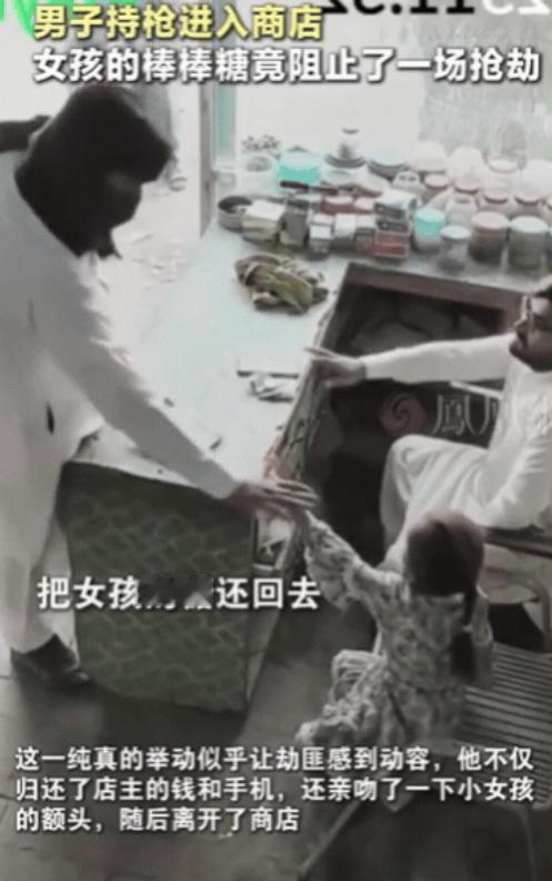 人之初,性本善!巴基斯坦一男子持枪闯入商店,威胁店主交出现金和手机,见店主磨磨蹭蹭,男子直接捶打其头部催促,令人意想不到的是,坐在旁边的四五岁女儿,竟然向劫匪递出手中的棒棒糖,店主吓得不敢动,男子被小女孩纯真的举动感动,他不仅归还了店主的钱和手机,还亲吻了一下小女孩的额头,随后离开了商店,网友:女孩的棒棒糖竟阻止一场抢动! 在那家不起眼的小商店里,空气仿佛在一瞬间被凝固了,一名陌生男子闯入时携带的戾气,几乎填满了那个狭窄的空间,他不是来买东西的,他是来“要命”的,那把枪重重地拍在柜台上的声音,对于正在看店的五十多岁大叔来说,无异于平地惊雷。 劫匪显然是个急性子,或者说是那种被生活逼入绝境后的歇斯底里,眼看店主因为极度惊恐而动作迟缓,手忙脚乱地打不开钱箱,男子的耐心瞬间耗尽,拳头带着怒气直接砸向店主的头部,他在用疼痛催促着受害者交出这一天的流水和手机。 而在这种充斥着成年人世界的暴力、吼叫和贪婪的背景下,画面的角落里却坐着一个扎着辫子的四五岁小女孩。 她本该是这幅恐怖画面中最脆弱的一环,坐在小凳子上的她,目睹了父亲被恐吓的全过程,这种巨大的反差,让人揪心,似乎下一秒悲剧就要不可避免地发生。 然而谁也没料到,就在店主哆哆嗦嗦把钱推出去的时候,这个稚嫩的孩子从角落里走了出来,她没有尖叫逃跑,也没有嚎啕大哭,而是做了一个让时间静止的动作。 小女孩手里攥着一根可能已经握了很久、有些温热甚至快要融化的棒棒糖,她一步步挪到那个凶神恶煞的持枪暴徒面前,缓缓递出了手里的糖果。 有一种浪漫且感性的解读认为,这是孩子纯洁无瑕的善良,是人性之初最美好的光辉,试图用甜味去化解成人的苦涩,这种观点固然温暖,但结合当时高压的环境,另一种残酷的现实主义推测似乎更具说服力。 仔细想想,一个不到学龄的孩子,在看到父亲不得不交出所有“值钱财物”来换取平安时,她的模仿行为或许完全出于一种求生的本能恐惧,在她那个小小的世界观里,爸爸交出了钱,那她也必须交出自己视若珍宝的东西——那根棒棒糖。 如果是前者,我们感叹天使在人间;如果是后者,这场景则令人心碎。她可能根本不懂什么是感化,她只是单纯地在“缴械投降”,希望用自己仅有的财富,来平息这个怪兽的怒火,让自己和爸爸活下来。 不管小女孩的动机究竟是无知者无畏的善意,还是被吓破胆后的献祭,这一行为产生的“化学反应”却是实打实的震撼,那个已经抢红了眼的男人,在看到糖果递到眼皮底下的那一刻,整个人仿佛被按下了暂停键,那一两秒的凝视,不仅是对糖果的迟疑,更像是一次剧烈的心理地震。 他最终伸出手接过了那根棒棒糖。我们无法得知那一刻他脑子里闪过了什么——也许是家里那个等钱救命的亲人,也许是这辈子从未被人如此“温柔”对待过的委屈,又或者是想到了自家同样年纪的孩子,那个瞬间,递过来的糖像一把钥匙,意外打开了他心底还没彻底锈死的良知枷锁。 接下来的举动令人动容,他没有卷款潜逃,这个刚刚还挥舞着手枪、殴打老人的暴徒,将抢来的现金和手机哗啦一声全部推回了柜台。 随后他弯下腰,在那个递糖女孩的额头上轻轻亲了一下,这轻轻一吻,不是基于劫匪的身份,而是回归了一个“人”或者是“父亲”的角色。 这场原本注定要走向深渊的犯罪,前后历时不到三分钟,却经历了起承转合的完整闭环,从举枪时的杀气腾腾,到离去时的两手空空,改变结局的并不是警察的威慑,也不是店主的反抗。 而是一个非理性的、甚至有些荒谬的微小变量,那一刻,他得到的不是甜蜜的糖果味,而是一次关于尊严和底线的重新确认。