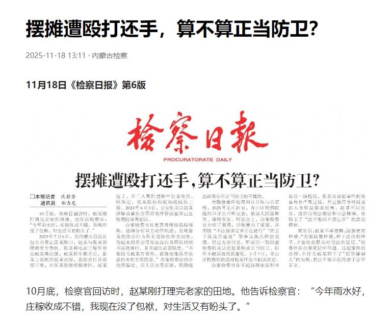 内蒙古包头市,一男子摆摊时和另一摊主因摊位归属问题发生了争执,对方摊主先动手打了男子三拳,在他准备继续殴打男子时,男子进行了还击,结果下手重了点,造成对方轻伤二级。案发后,公安机关发现男子有前科,所以认定男子主观上具有伤害的故意,无视了男子正当防卫的辩解,以男子涉嫌故意伤害罪将案件移送到检察院进行审查起诉。(来源:内蒙古检察) 据悉,男子赵某此前因犯事被判了刑,刑满释放后为了生活,赵某就找了个地方摆摊赚点生活费。 2023年7月6日,赵某摆摊摆得好好的,男子张某突然推着电动三轮车停在赵某的摊位前,要求赵某把这个位置让给对方。 赵某明白张某是想抢位置,但又不太想惹麻烦,于是话都没说直接把车给挪了一点,腾出一点位置给张某。 可张某却不乐意了,见赵某直接无视自己,感到十分没面子,于是冲上去抓住赵某的衣服,对着赵某的脸就是三拳。 赵某没想到张某如此霸道,在看到张某还准备继续动手时,赵某立即进行了格挡反击,很快二人便扭打在一起。可谁知张某就是个花架子不禁打,赵某没几下就把张某给打伤了,后经鉴定为轻伤二级。 赵某没想到,正因为自己的还手行为,导致生活全乱了。他也不敢再摆摊,怕惹麻烦,只能回老家种地。原本打算靠摆摊挣点钱的,这下彻底没戏了,生活也陷入困境,心里压力更大。 因为在案发后,公安机关对赵某多次审问。在发现赵某有犯罪前科,且与张某存在互殴行为后,认定赵某主观上具有泄愤的故意,所以认定赵某的行为涉嫌故意伤害罪。 2024年6月3日,公安机关将案件移交至检察院审查起诉。然而检察院在审查案件事实时,发现了一丝问题。 后检察院召开了听证会,邀请了人民监督员和律师到场听证,且将张某和赵某的整个动手过程一帧一帧分析,还原了整个案件的事实。 从监控来看,张某的抢摊位行为是双方矛盾爆发的起因,且是张某先动手攻击赵某。在对方没有停手的趋势下,赵某才进行了反击,致张某受伤。 《刑法》第20条规定,为了使国家、公共利益、本人或者他人的人身、财产和其他权利免受正在进行的不法侵害,而采取的制止不法侵害的行为,对不法侵害人造成损害的,属于正当防卫,不负刑事责任。 由此可见,只有在不法侵害行为进行时,实施防卫性反击,才能认定正当防卫。 张某在连打了赵某三拳后,准备继续实施殴打时遭到了赵某的反击,随即二人扭打在一起,这符合不法侵害行为正在进行时的特征。 此外《正当防卫指导意见》中对于防卫是否超过必要限度,也作出了明确指示,需要综合不法侵害的性质、手段、强度、危害程度和防卫的时机、手段、强度、损害后果等情节,考虑双方力量对比,立足防卫人防卫时所处情境,结合社会公众的一般认知作出判断,不应当苛求防卫人必须采取与不法侵害基本相当的反击方式和强度。对于防卫行为与不法侵害相差悬殊、明显过激的,应当认定防卫明显超过必要限度。 检察院认为,赵某在反击张某时,同样是赤手空拳,其与张某实施的不法侵害行为的性质相差不大,也没有明显的过激行为,在张某被制服后,赵某也停了手。 同时,检察院认为赵某的行为没有明显超出必要限度,且没有给张某造成重伤或死亡的结果。轻伤并不属于重大损害。 最重要的是,检察院认为,赵某虽然有前科,但并不代表有前科的就一定存在故意伤害的主观故意,这之间并没有因果关系。 经过讨论,人民监督员、律师等听证人员均认为赵某的行为符合正当防卫的条件。 因此,检察院认为赵某的行为属于正当防卫,故作出了不予起诉决定。 对于这一决定,对赵某来说无疑是天大的好消息,不起诉决定与案件事实不清,证据不足,不予刑事处罚的结果是不同的。不起诉决定相当于没有任何犯罪事实,也不会留下刑案记录。 对于本案,您怎么看?欢迎留言交流。(注:打架图片中人物非本案当事人,仅做配图使用)