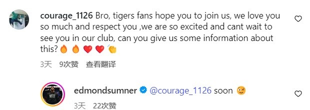 一名网友表示希望他加盟广东男篮,问他能否提供一些信息时,萨姆纳回复:“很快。”