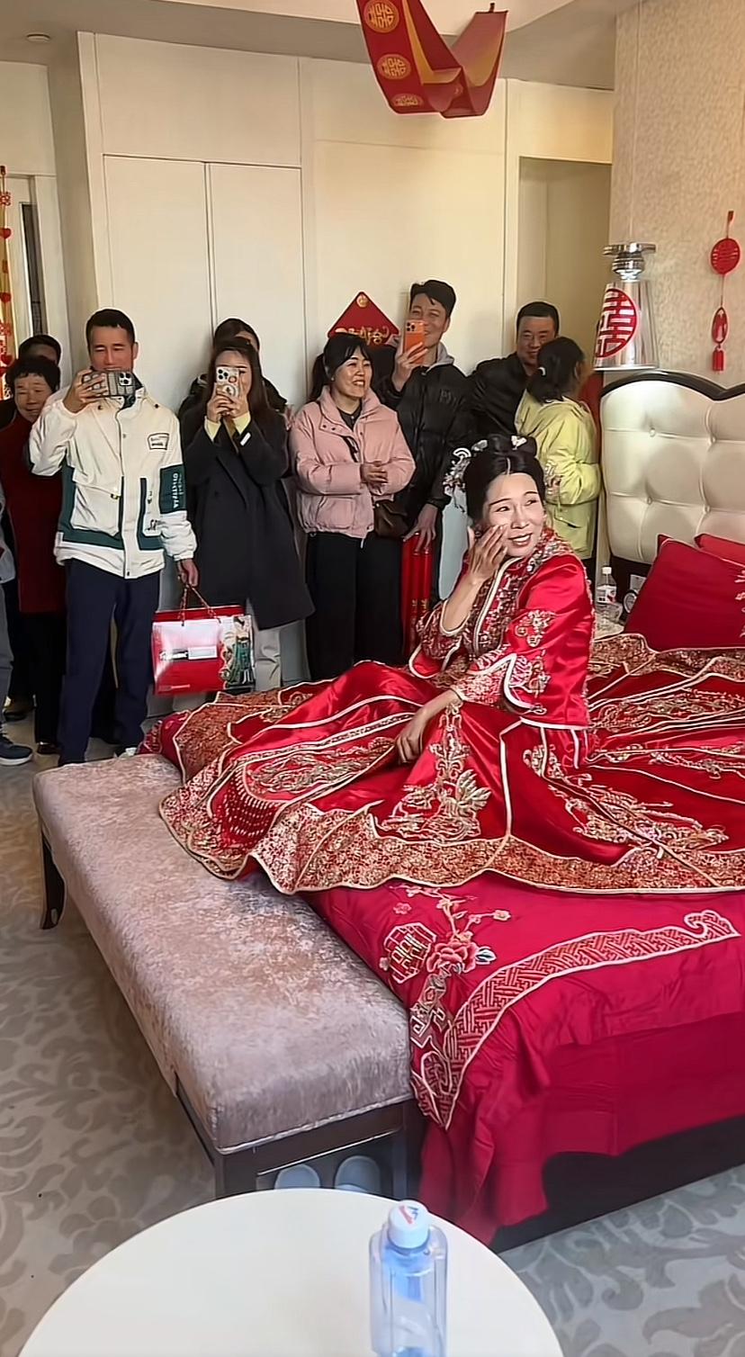 大姐够多大了?感觉不年轻了,床下站的帅小伙真年轻,一群人围着祝福,那是真爱啊,都